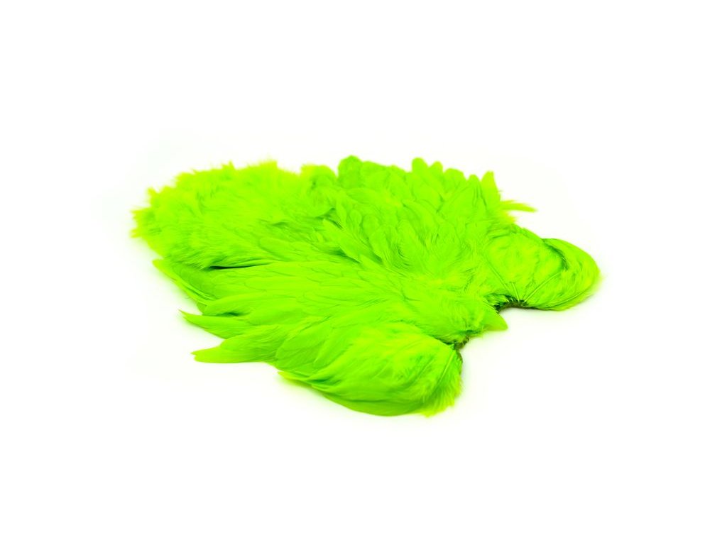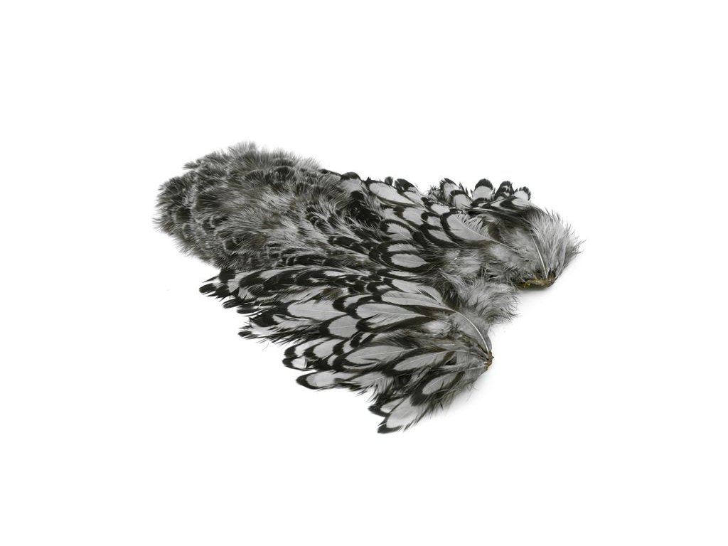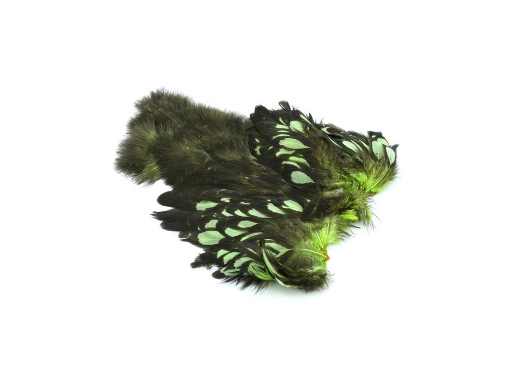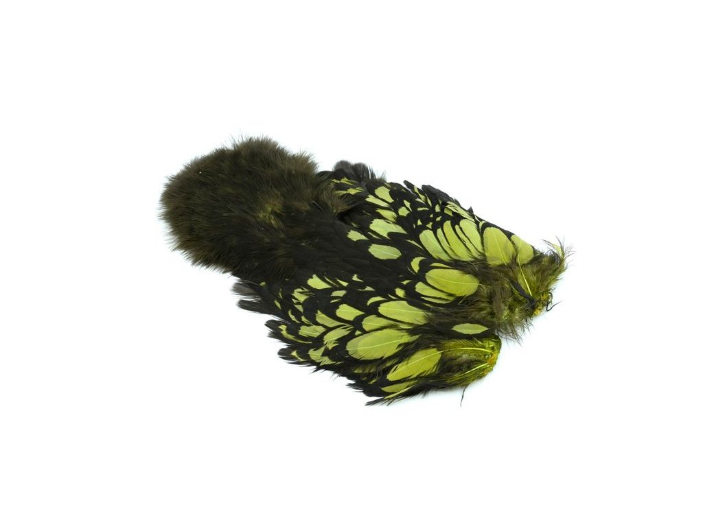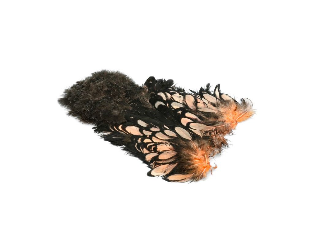 Subsurface flies which incorporate feathers can create some of the most attractive and effective fishing flies. The Whiting Farms Soft Hackle with Chickabou pelt provides two distinct types of feathers for these exceptional subsurface flies, each with a multitude of applications. Soft Hackle: The Top portion of the pelt contains two panels of full web, Matuka type, wet fly feathers. The feathers on either panel are mirror images of one another and so can be paired for balanced opposing sides of the fly. These feathers, when used full, are ideal for Matuka and Sculpin flies. They are also great for shorter tarpon and saltwater flies, and full feather bass and panfish flies. They are also excellent for wrapped hackle applications for steelhead and salmon flies. Chickabou: The marabou-like feathers at the narrow end of the pelt are much finer and more delicate than traditional turkey marabou, which tends to be too large and coarse for many flies. Chickabou can be used in two basic ways. Tied in as tails on Wolly Buggers or as body material for incredibly alive, breathing and undulating motion.
