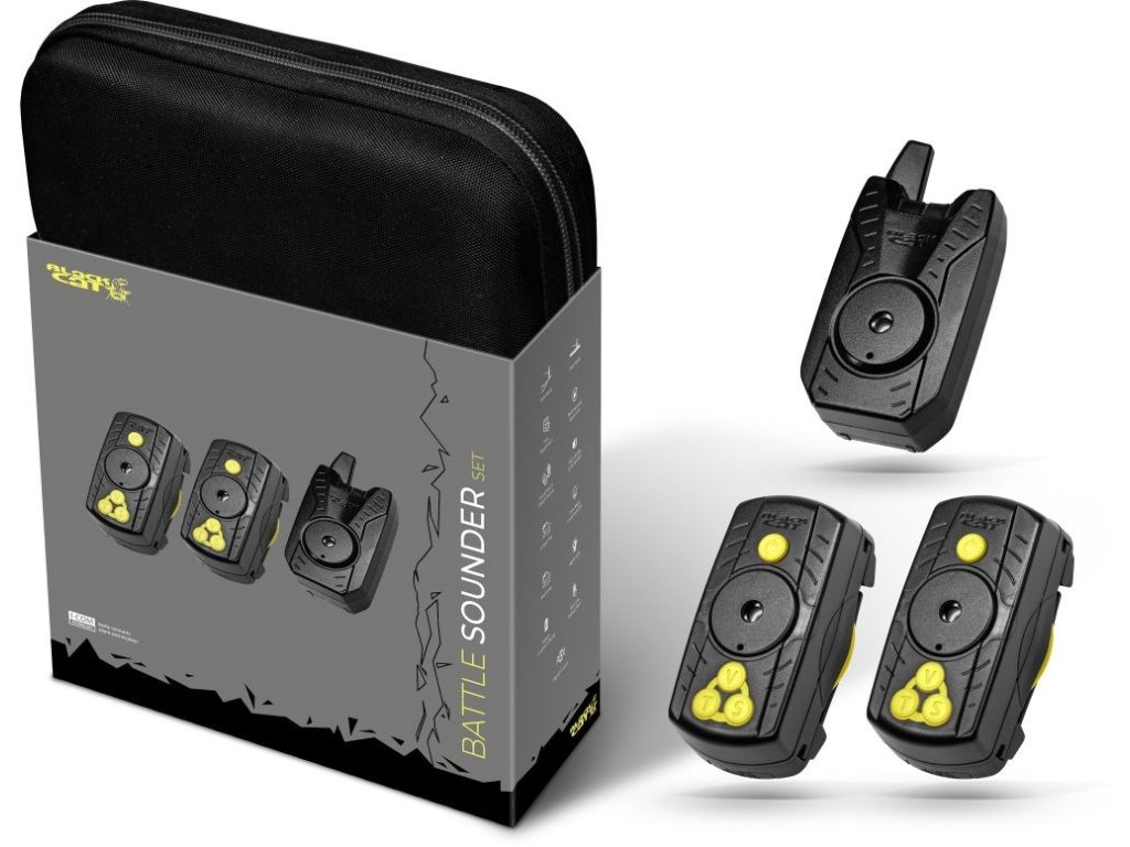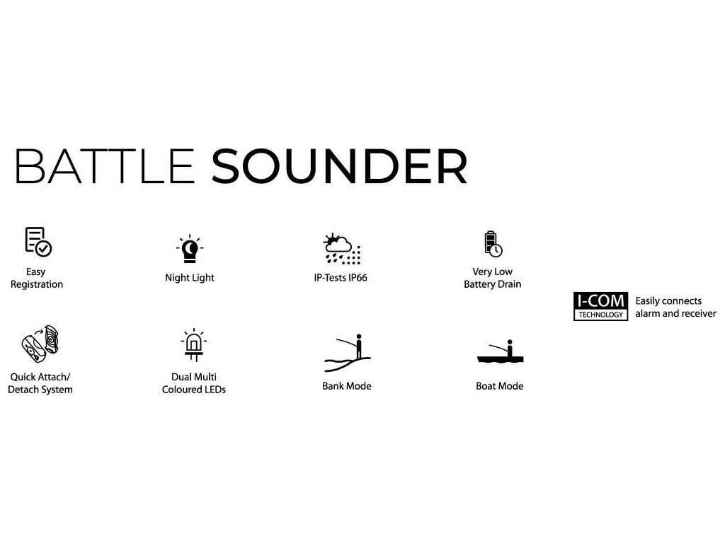 - Signalizátory Battle Sounder disponujú digitálne dynamickou identifikáciou záberov, veľmi citlivým, nastaviteľným alarmom ohybu prútu a alarmom spätného rázu, ktorému sa tiež hovorí Snapback Alarm.