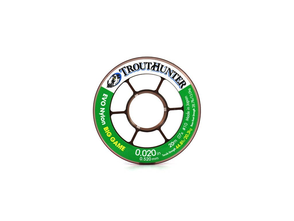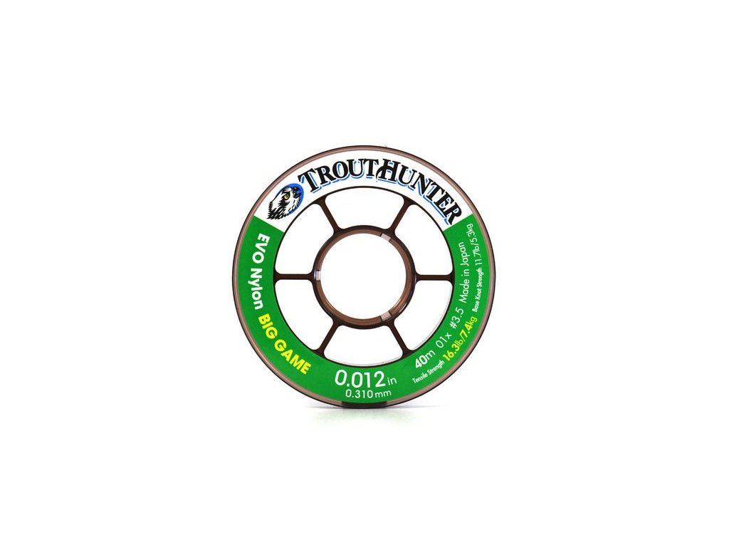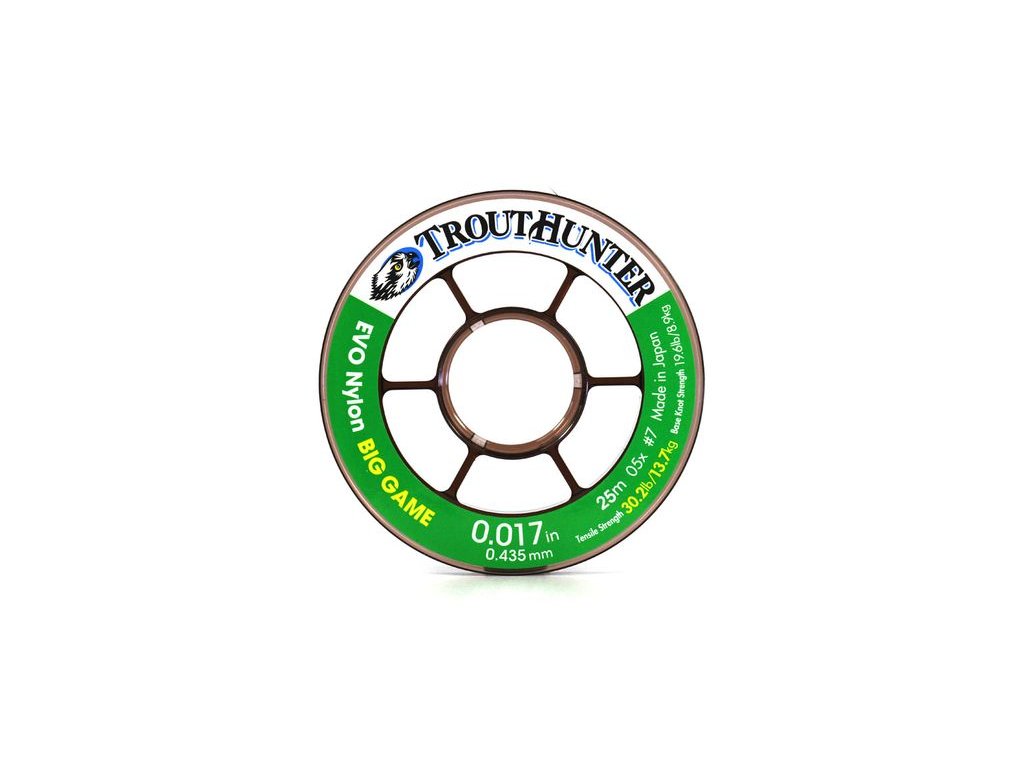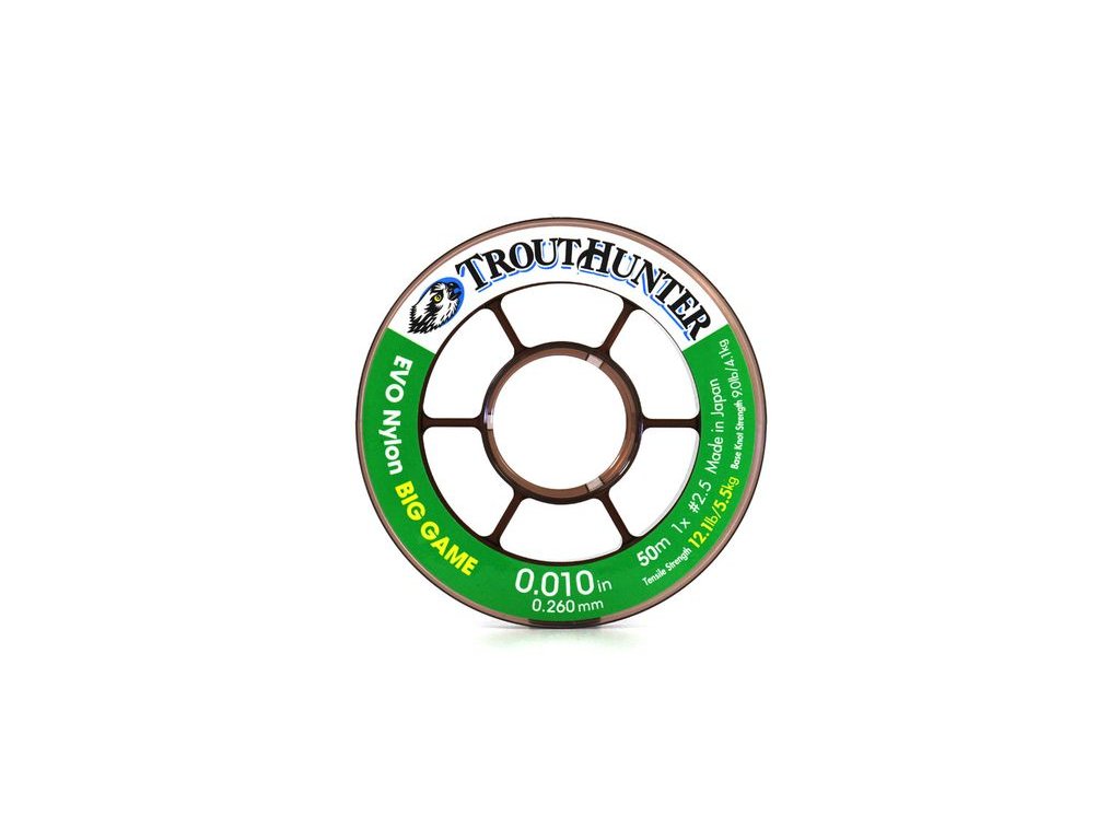 TroutHunter Big Game EVO Nylon will appeal to dedicated saltwater and anadromous anglers who target technical fish and value greater strength to diameter ratios, higher abrasion resistance, and superior knot strength. Ideal for building custom leaders. Available from 12.1# - 44.8# test on newly designed 3" large arbor spools. 50 meters. ALL TroutHunter tippet spools fit together for ease of carrying multiple sizes, and yes, the new Big Game spools fit on our tippet tender.