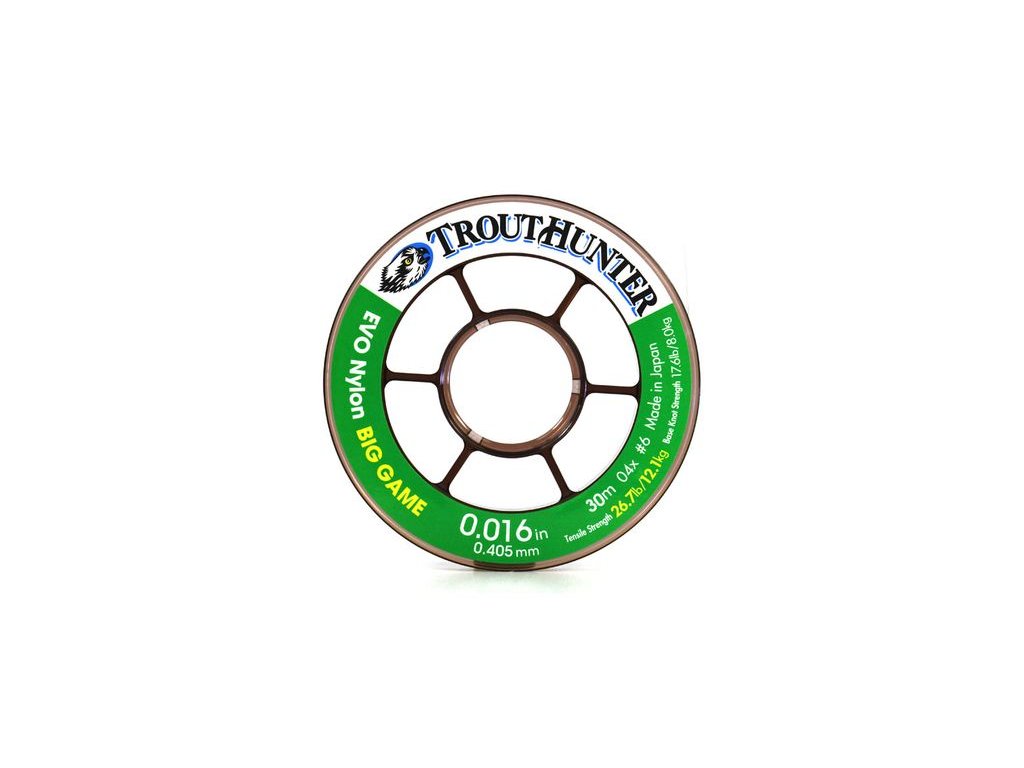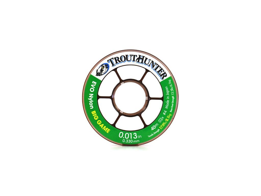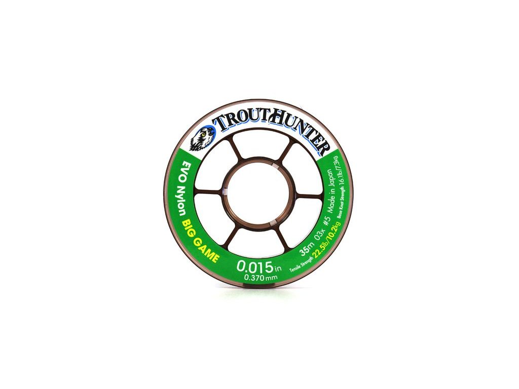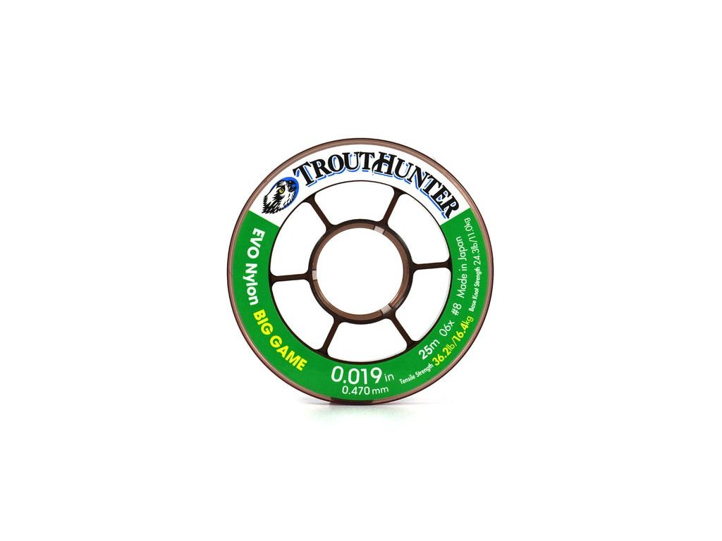 TroutHunter Big Game EVO Nylon will appeal to dedicated saltwater and anadromous anglers who target technical fish and value greater strength to diameter ratios, higher abrasion resistance, and superior knot strength. Ideal for building custom leaders. Available from 12.1# - 44.8# test on newly designed 3" large arbor spools. 50 meters. ALL TroutHunter tippet spools fit together for ease of carrying multiple sizes, and yes, the new Big Game spools fit on our tippet tender.