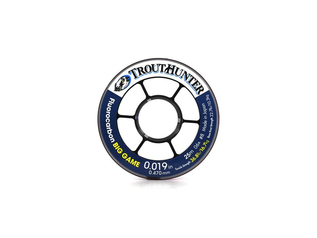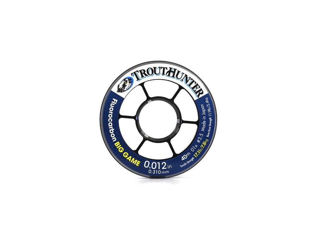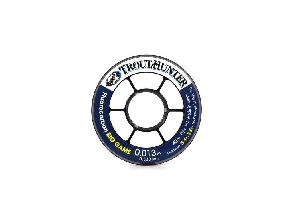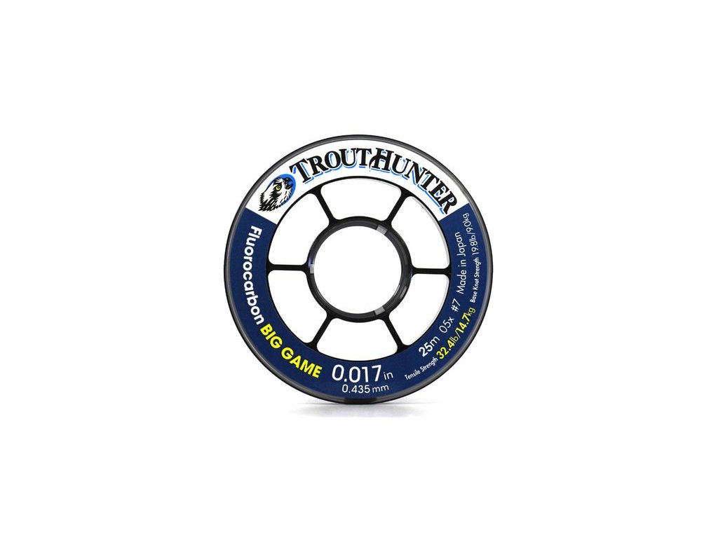 TroutHunter tippet spools deliver superior performance in all aspects of measurement. U.V., fluorescent, and water resistance packaging provides assurance that you are getting the freshest material possible. Slim, larger arbor poly-carbonate tippet spools ensure low memory while color-coded hydrophobic tippet tenders provide quick identification and water repellency. All spools are transparent so that you may quickly ascertain how much material is left. TroutHunter Big Game Fluorocarbon has gained a cult following among serious flats junkies and anadromous fish chasers due to its strength, abrasion resistance, and invisibility. Don't bring a knife to a gunfight - get the hunter's edge. Available in strengths from 12.8# - 45.2# test on newly designed 3" spools. 50 Meters.