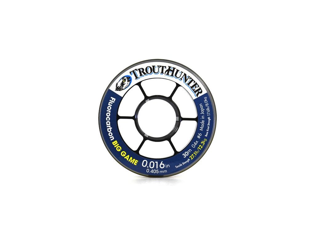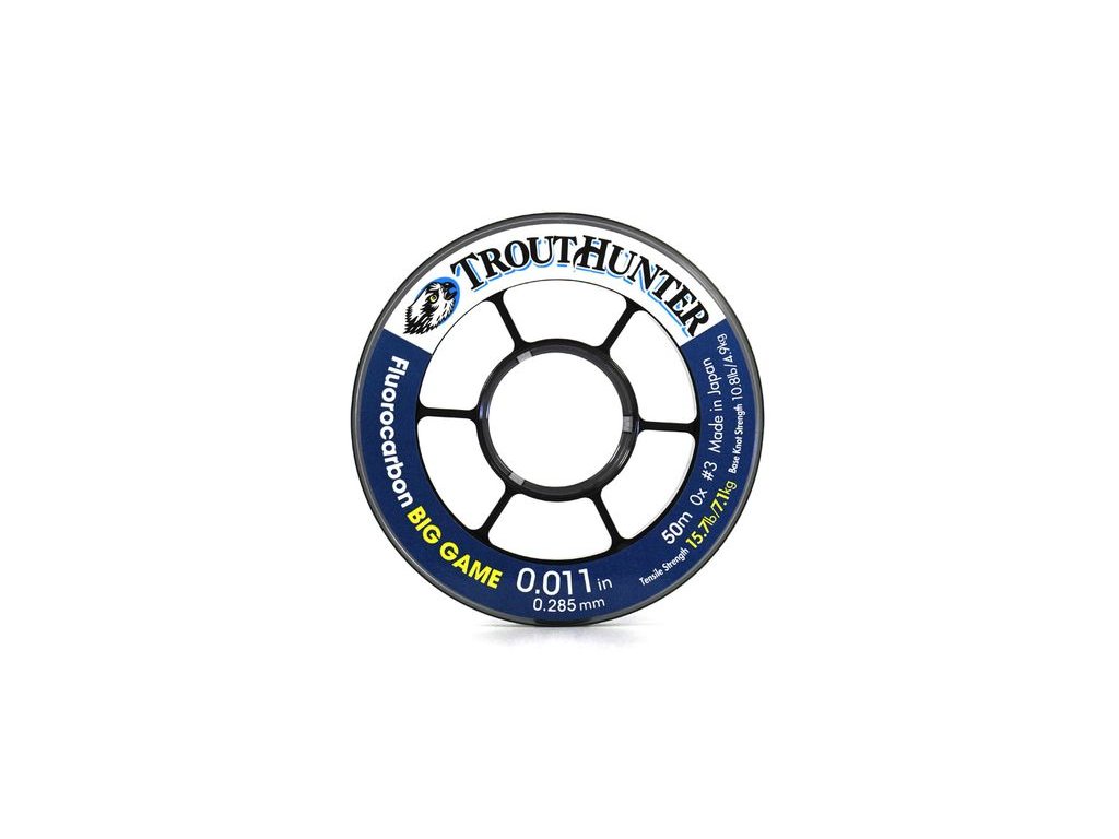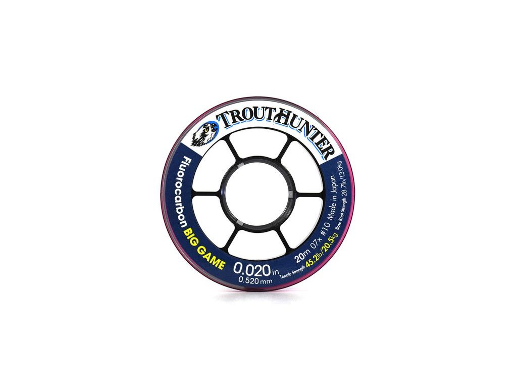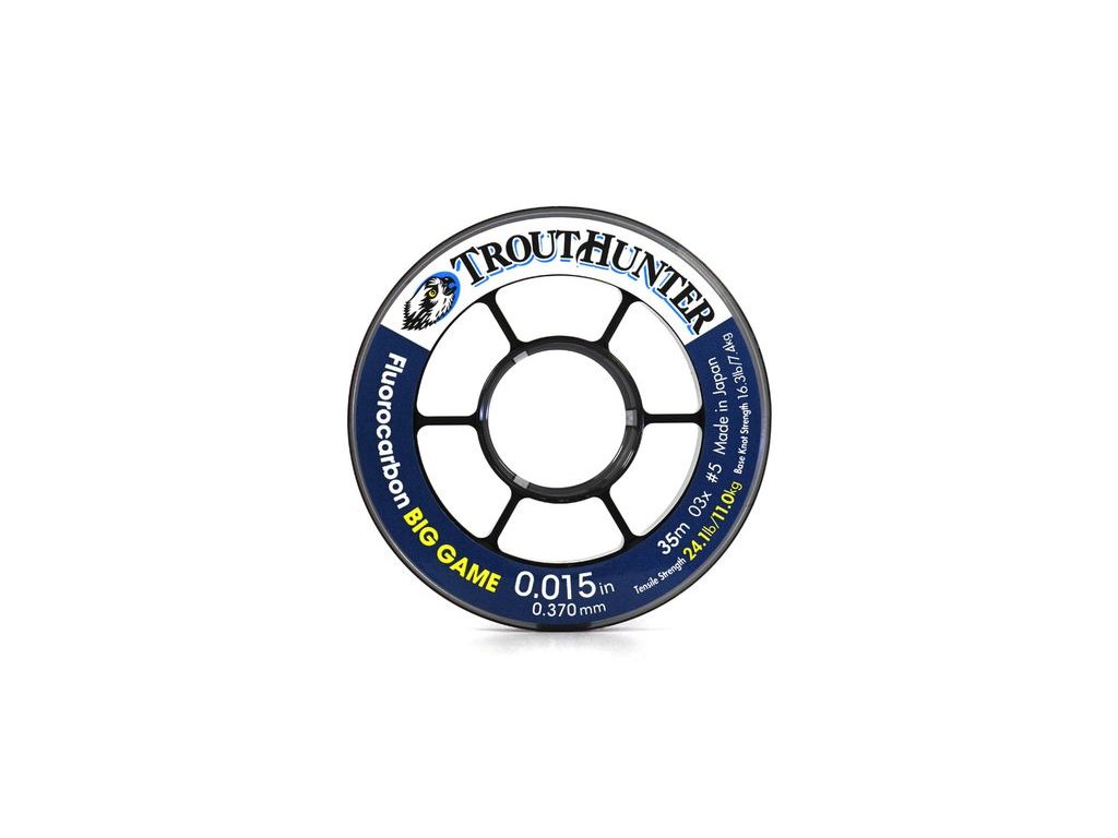 TroutHunter tippet spools deliver superior performance in all aspects of measurement. U.V., fluorescent, and water resistance packaging provides assurance that you are getting the freshest material possible. Slim, larger arbor poly-carbonate tippet spools ensure low memory while color-coded hydrophobic tippet tenders provide quick identification and water repellency. All spools are transparent so that you may quickly ascertain how much material is left. TroutHunter Big Game Fluorocarbon has gained a cult following among serious flats junkies and anadromous fish chasers due to its strength, abrasion resistance, and invisibility. Don't bring a knife to a gunfight - get the hunter's edge. Available in strengths from 12.8# - 45.2# test on newly designed 3" spools. 50 Meters.