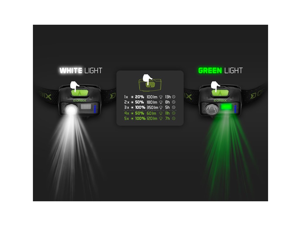 Prepracovaná čelová lampa spĺňajúca všetky požiadavky pre váš nočný lov, či vychádzky do prírody. Čelovka disponuje výkonom 5 W a svietivosťou až 350 lm, čo zabezpečuje dostatočné osvetlenie vášho okolia. Delphin ORBIX je vybavená pohybovým senzorom, vďaka ktorému ju dokážete poľahky vypnúť a zapnúť mávnutím ruky.Na čelovke sa nachádzajú dve LED diódy, ktoré ponúkajú možnosť bieleho alebo zeleného svetla. Pri prvom stlačení spínacieho tlačidla sa rozsvieti biele svetlo s intenzitou 20 % (100lm), pričom batéria vydrží 13h. Opakovaným stlačením sa aktivuje režim 50 % s výdržou 8 hodín, a tretím stlačením sa rozsvieti biele svetlo na 100 %, pričom batéria vydrží 5 hodín.