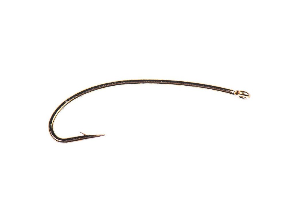 Háčik na nymfu s dlhým ramienkom v zahnutom dizajne. - Bronzová povrchová úprava - Chemicky naostrené - Malý bodec - Balenie 25 háčikov