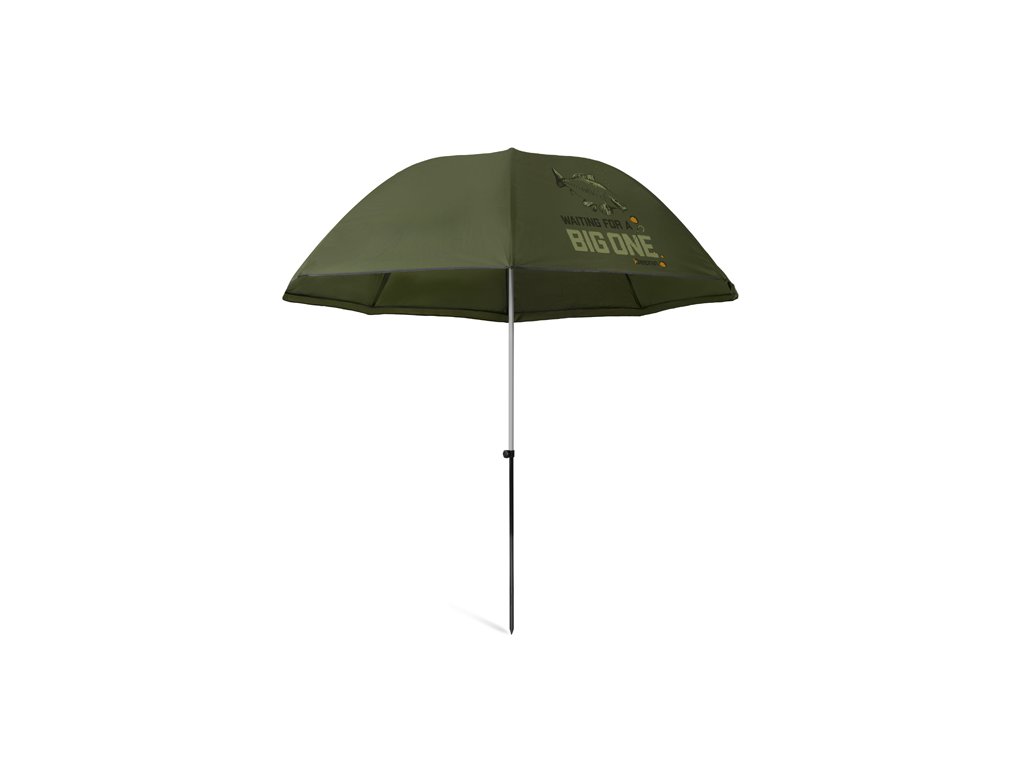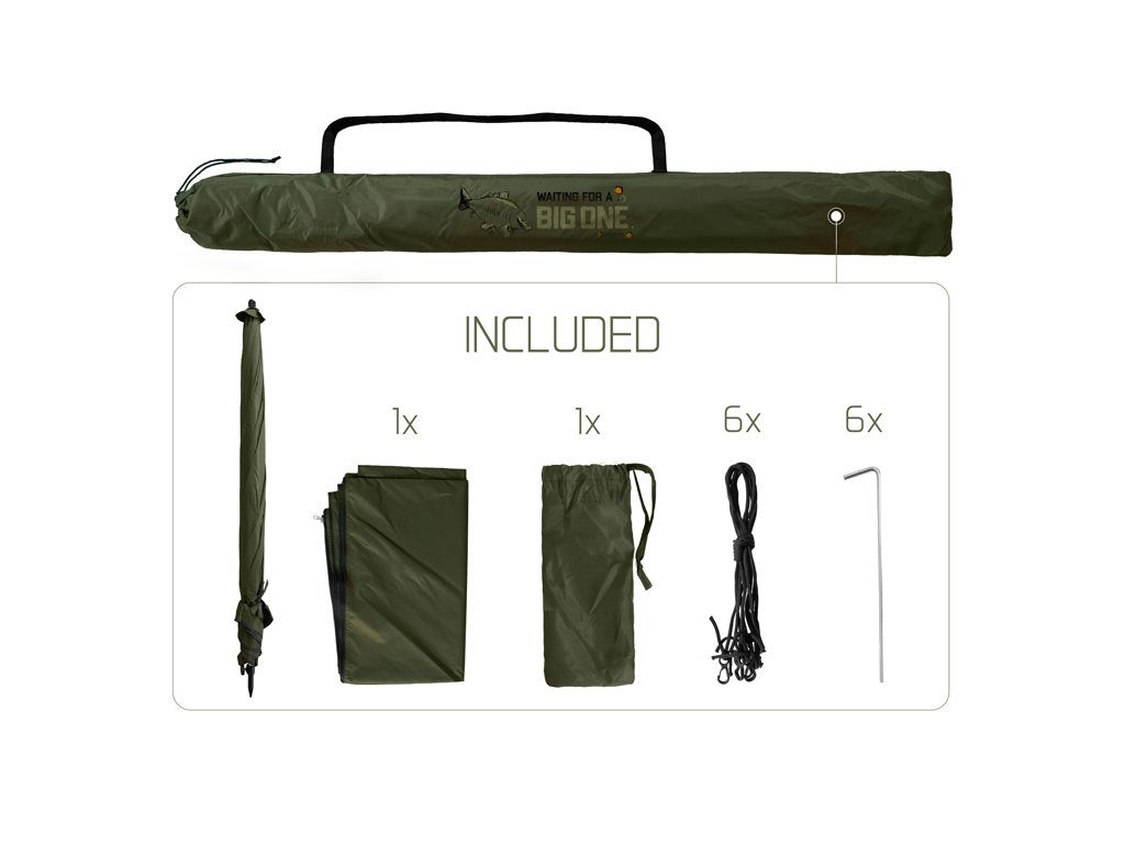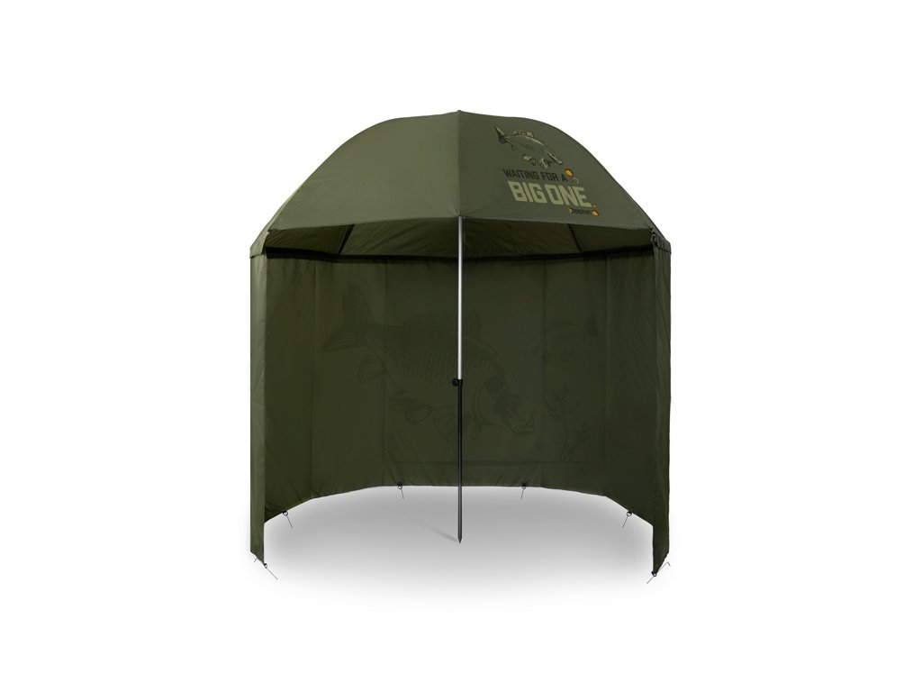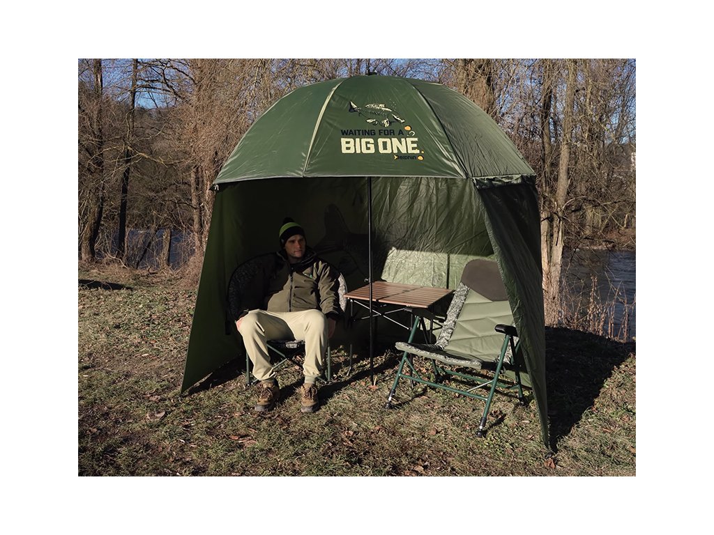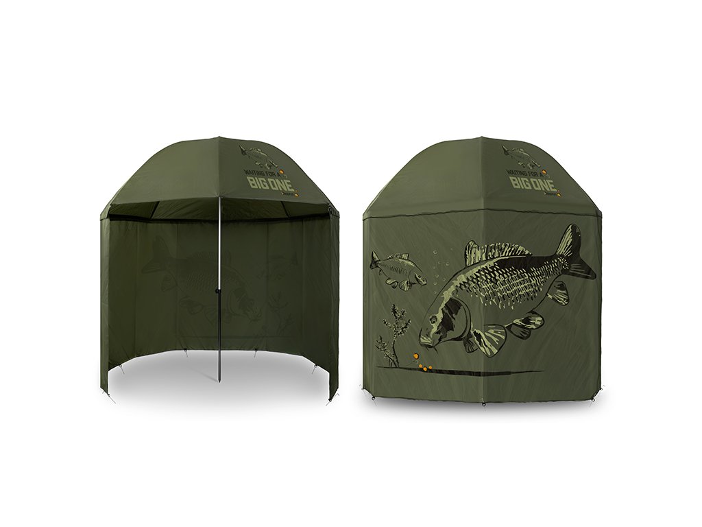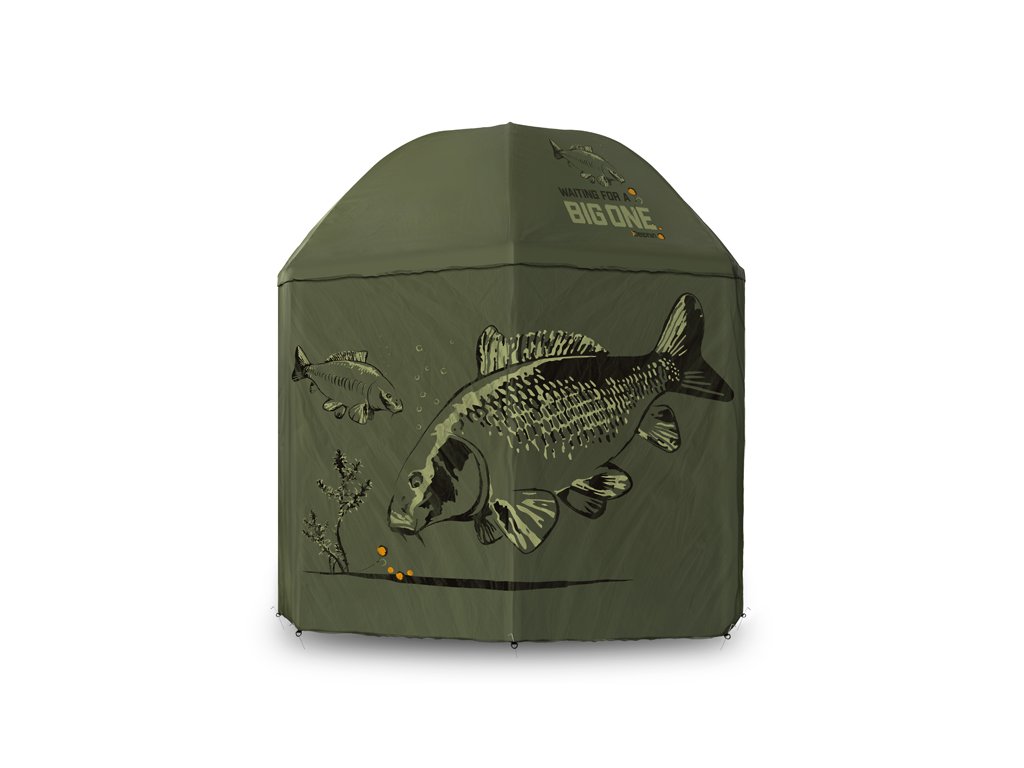 Delphin BigONE CARP je praktický dáždnik, ktorý vás dokonale ochráni pred nepriaznivým počasím počas vašich vychádzok k vode. Dizajn dáždnika bol špeciálne prispôsobený vyznávačom lovu kaprov, a to najmä vďaka veľkým a výrazným grafikám kapra na kupole a bočniciach dáždnika.Vďaka kupole s rozmerom 250cm a bočnicou siahajúcou do 3/4 obvodu vás dáždnik ochráni pred intenzívnym dažďom, silným slnkom, ale aj nepríjemným vetrom. Rozmery dáždnika poskytujú dostatok priestoru pre rozostavenie dvoch kresiel a malého stolíka. Teleskopická tyč umožňuje nastavenie výšky dáždnika a jej koniec je zakončený kvalitným hrotom pre zapichnutie do zeme. Pre zabezpečenie 100% nepremokavosti aj počas intenzívnych dažďov sú švy dáždnika za horúca kompletne podlepené vodeodolnou páskou. K dispozícii je bočná, predĺžená stena ktorá sa upevňuje pomocou kvalitného zipsu okolo kopuly. Spodná časť bočnice je osadená úchytmi pre upevnenie k zemi pomocou zaisťovacích kolíkov (kolíky sú súčasťou balenia).
