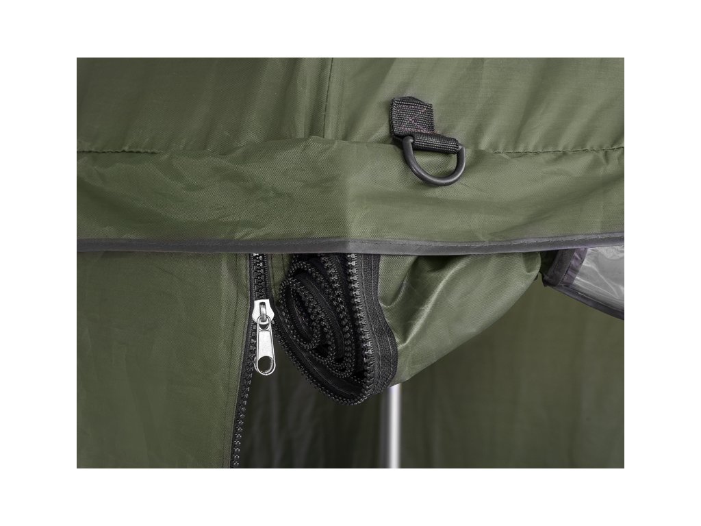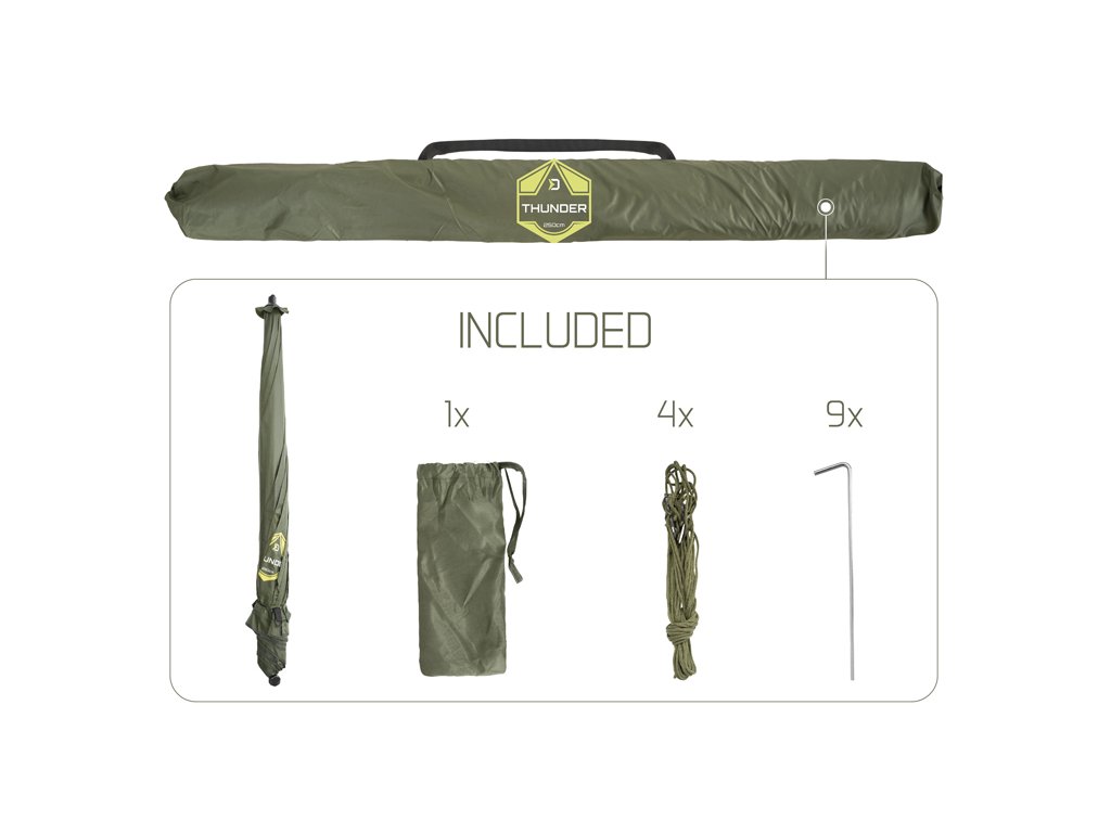 Dáždnik s kompletne uzatvárateľnou bočnicou Delphin THUNDER FullWALL je ideálnou voľbou do nepriaznivého počasia počas kratších výprav. Perfektne ochráni pred nepríjemným slnkom, rannou rosou, ale aj vyšším úhrnom zrážok. Pre lepšiu stabilitu vo vetre je opatrený štyrmi ukotvovacími lanami. Švy dáždnika sú dôkladne podlepené vodeodolnou páskou pre zabezpečenie 100% nepremokavosti aj v prípade silného dažďa.Vďaka bočnej predĺženej stene po celom obvode, budete pred nepriaznivými podmienkami chránený zo všetkých strán. Bočnica disponuje dverami, ktoré sú opatrené kvalitnými zipsami. Okrem toho sa na dverách nachádza priehľadné plastové okno, vďaka ktorému budete z dáždnika vidieť na prúty aj počas dažďa.
