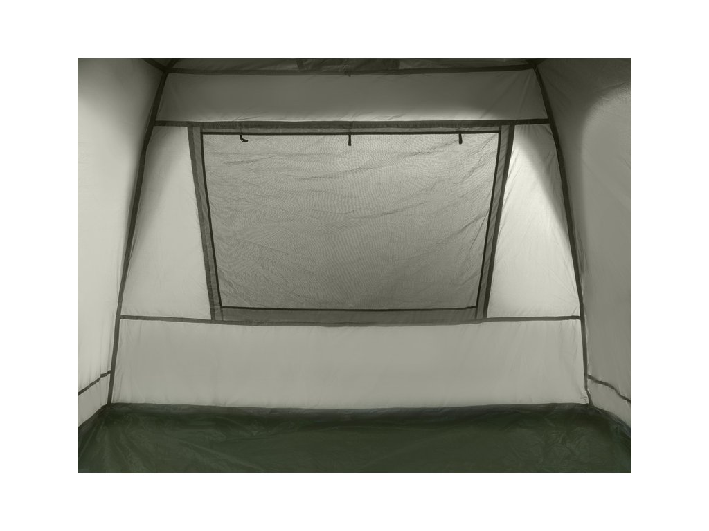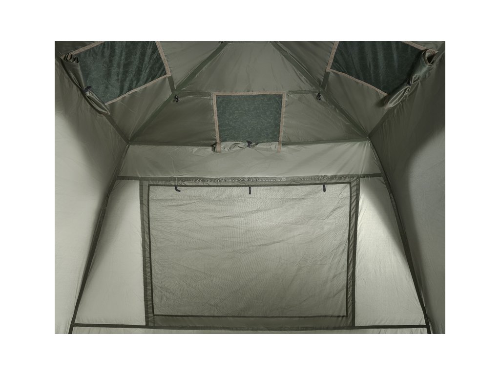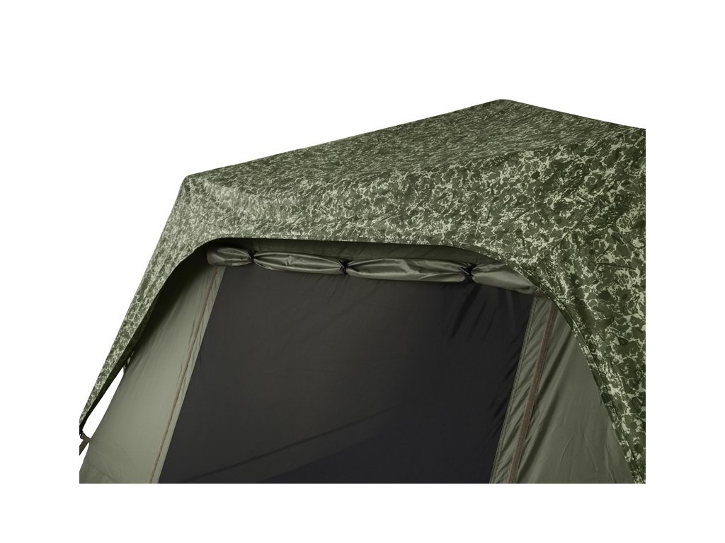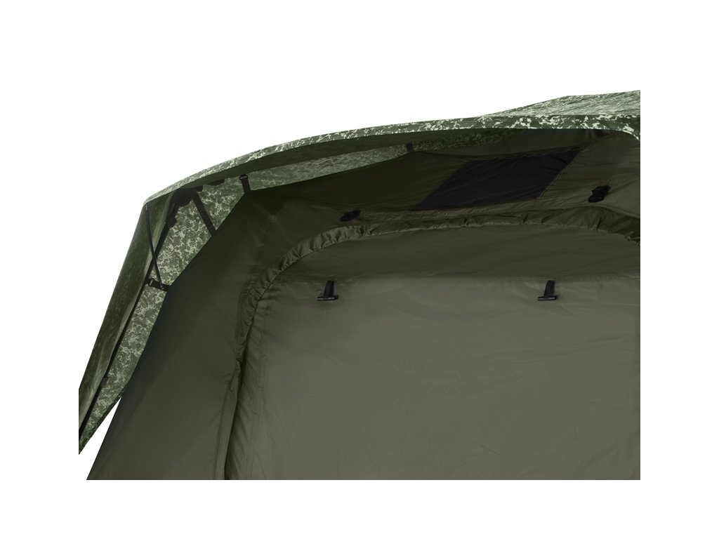 Veľkou devízou je dôkladne navrhnutý vetrací systém, pozostávajúci z niekoľkých okien a prekrytia, resp. “striešky“ bivaku. Rozmerné moskytiérové okno je umiestnené na prednom aj zadnom paneli, pričom štyri menšie okná sú umiestnené priamo na strope bivaku. Vďaka tomuto dômyselnému systému je možné zabezpečiť cirkuláciu vzduchu vo vnútornom priestore aj v čase, keď nie je možné vetrať pomocou veľkých okien. Určite ho oceníte najmä v noci, kedy výrazne napomáha znižovať kondenzáciu na vnútorných stenách. Súčasťou samotnej striešky je aj veľký šilt, ktorý vytvára dodatočnú ochranu pred slnkom a dažďom. Strieška je ku konštrukcii upevnená množstvom úchytov tak, aby bola čo najviac eliminovaná možnosť podfúknutia pri silnejšom vetre. K stabilite vo veternom počasí prispievajú taktiež 4 stabilizačné šnúry a kolíky, ktoré sú súčasťou balenia.