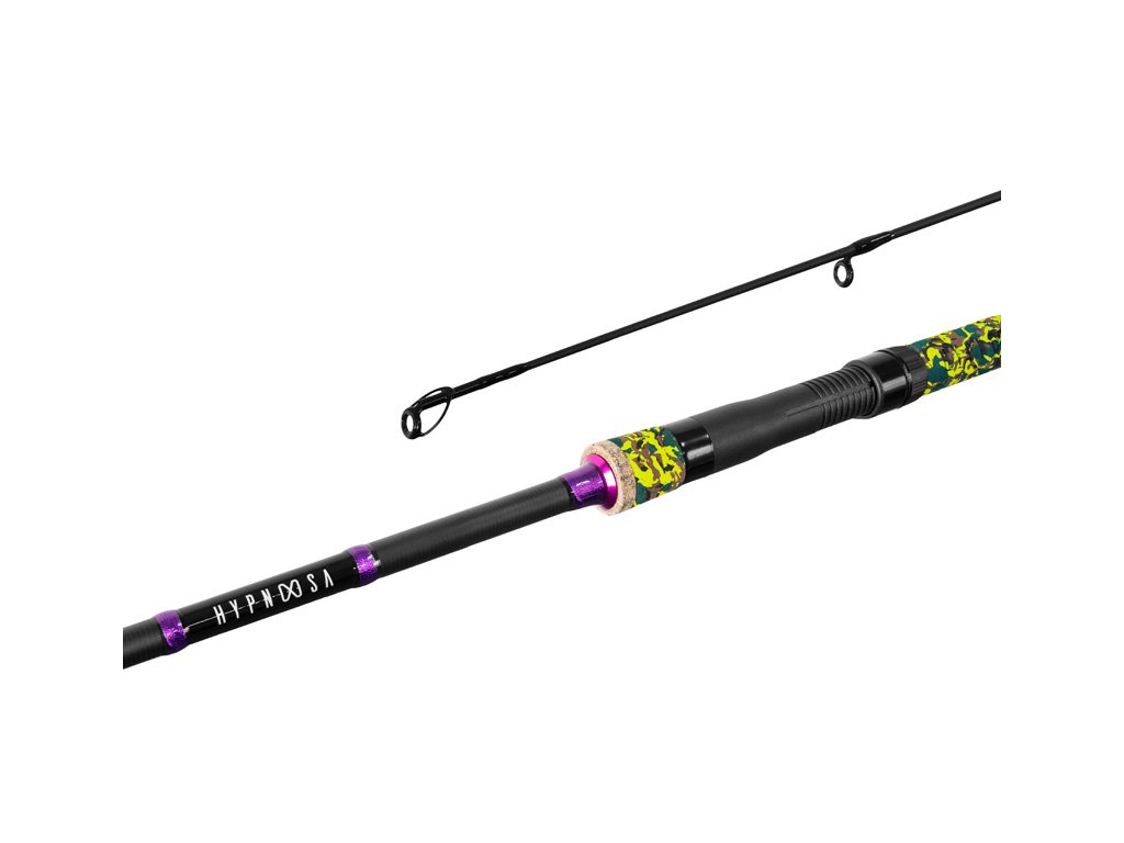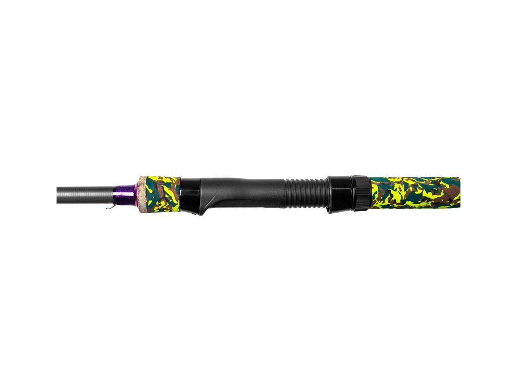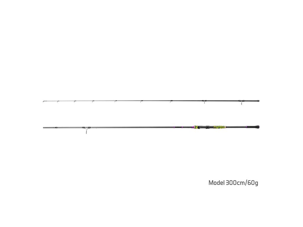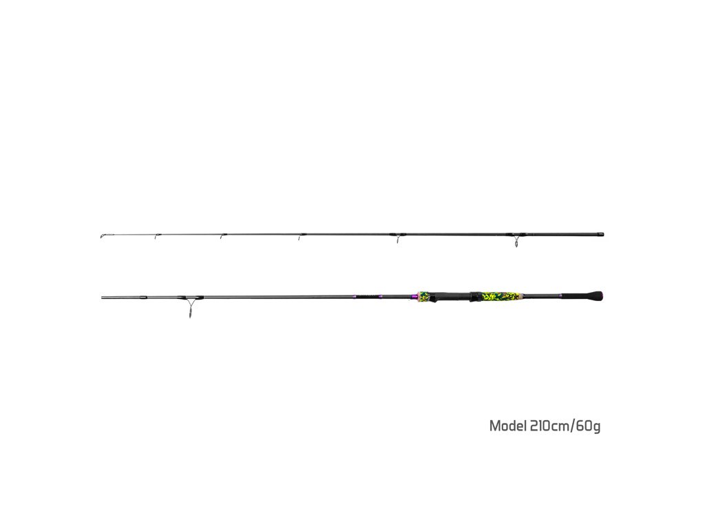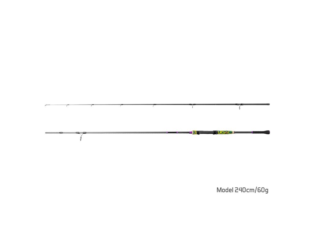 Zhypnotizujte všetky veľké dravce! Prúty pre všetkých, ktorým nič nehovoria zažité konvencie. Na prvý pohľad upúta rukoväť, ktorá je tvorená farebnou kamuflážou s použitím farieb žiarivá zelená, hnedá a zelená. Nad touto „hypnotickou“ rukoväťou nájdeme decentné korkové detaily a v celej spodnej tretine prúta nájdeme aj fialové zdobenia vyviazané niťou. Matný sivý blank a čierne viazanie očiek robí z tohto prúta elegantného spoločníka pri vode, zatiaľ čo moderne ladená spodná časť okamžite upúta pozornosť. Poloparabolická akcia na tuhšom blanku robí z tohto modelu veľmi účinnú zbraň na veľké dravce, ktoré prút dokáže pohodlne vypružiť v celej svojej dĺžke a pokojne zdolať aj srdnaté šťuky či menšie sumce.