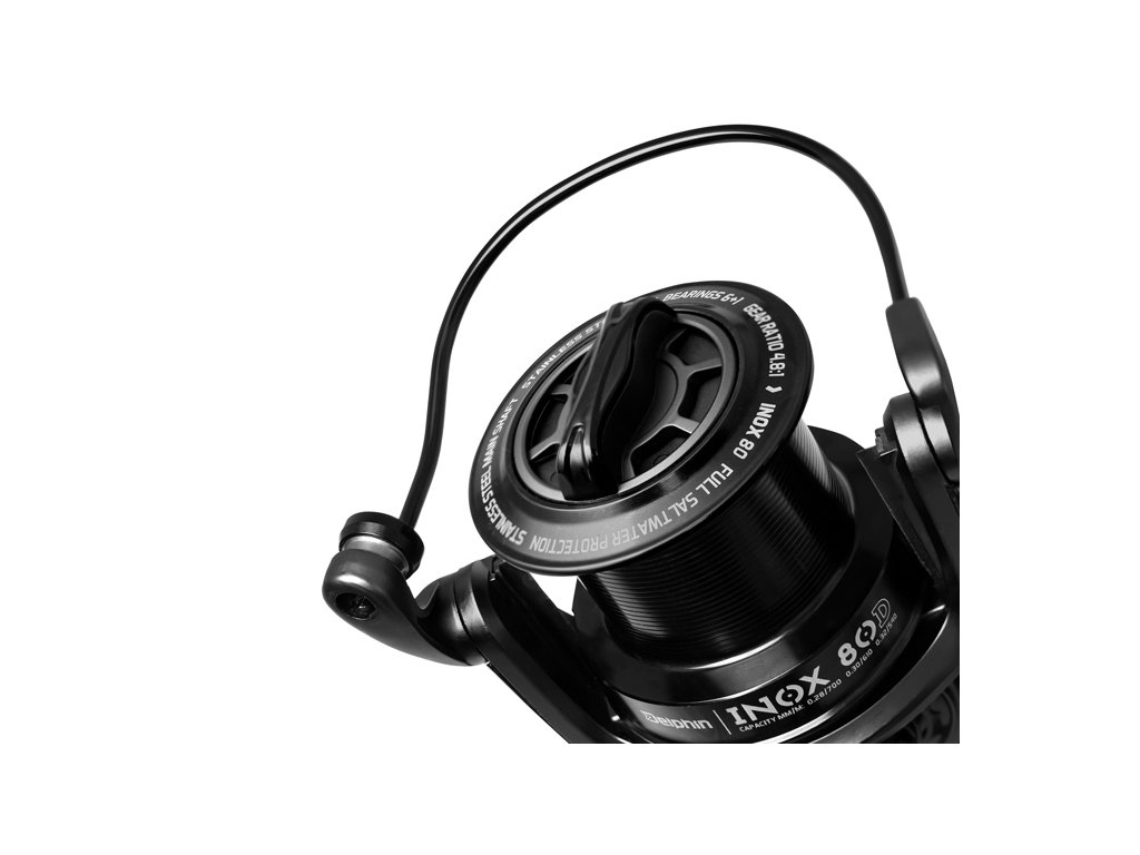 Delphin INOX predstavuje radu kaprárskych navijakov, ktoré už na prvý pohľad zaujmú svojím tmavošedým matným prevedením s lesklými čiernymi prvkami. Elegantný dizajn navyše dotvára precízne spracované drevené madlo na kľučke, ktoré výborne padne do ruky. Rada INOX prichádza v dvoch vyhotoveniach s označením 70D a 80D. Menší brat s označením 70D má kompaktnejšie rozmery a nižšiu hmotnosť čo ho predurčuje najmä k lovu na menších vodných plochách. 80D predstavuje veľkokapacitný navijak, ktorý vďaka svojmu robustnému vyhotoveniu zvládne aj tie najťažšie výzvy pri vašich výpravách za kaprami. Disponuje cievkou, ktorá pojme naozaj veľké množstvo vlasca a umožňuje tak lov aj vo veľkých vzdialenostiach a taktiež je vhodný na ďaleké nahadzovanie. Hlavným rozdielom okrem rozmerov je vyhotovenie kľučky. Pri modeli 80D ide o bežné prevedenie upevnenia, pri ktorom sa oska prevedie telom navijaka a dotiahne sa skrutkou na opačnej strane. Kľučka modelu 70D sa upevňuje naskrutkovaním priamo do tela navijaku, nemá tak žiadnu vôľu. Vnútri oboch modelov sa nachádza zoskupenie 6+1 guličkových ložísk z nehrdzavejúcej ocele, ktoré sa starajú o plynulý a hladký chod. Rotujúca hlava navijaku je opatrená nenápadnými časťami, ktoré slúžia ako zábrana proti spadnutiu vlasca pod cievku a jeho následnému zamotaniu. Oba modely disponujú systémom pomalej oscilácie tzv. “slow oscilation“ , ktorý zabezpečuje dôkladné ukladanie vlasca na cievku. Vďaka tejto vlastnosti sa pri nahadzovaní vlasec z cievky odmotáva omnoho ľahšie, čo ho predurčuje k naozaj ďalekým hodom. Vnútorné komponenty vyrobené z nerezovej ocele v kombinácií s odolnosťou voči slanej vode zaručujú dlhú životnosť a robia z neho navijak aj do tých najnáročnejších podmienok. K základnému baleniu je možné dokúpiť aj náhradnú hlbokú a taktiež plytkú cievku.Technické parametre: