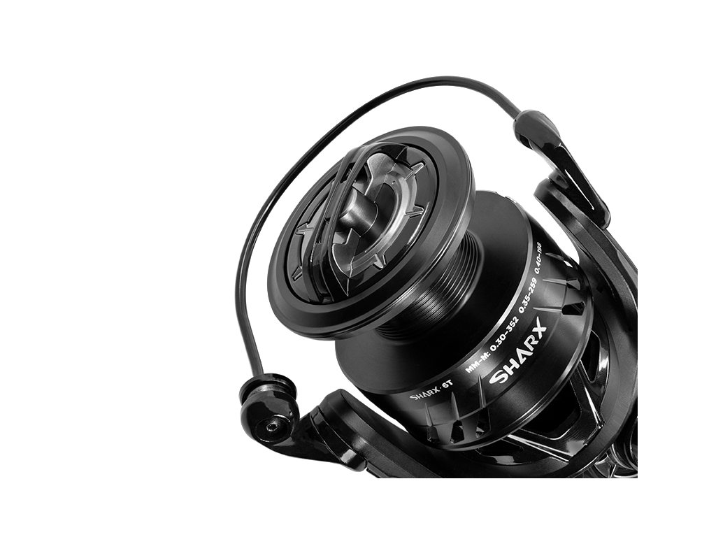 K pevnému a pohodlnému uchopeniu je kľučka osadená pogumovaným veľkým madlom, ktoré uľahčí zdolávanie aj tých najbojovnejších úlovkov. K navijaku SHARX je možné podľa potreby dokúpiť náhradnú plytkú aj hlbokú hliníkovú cievku.