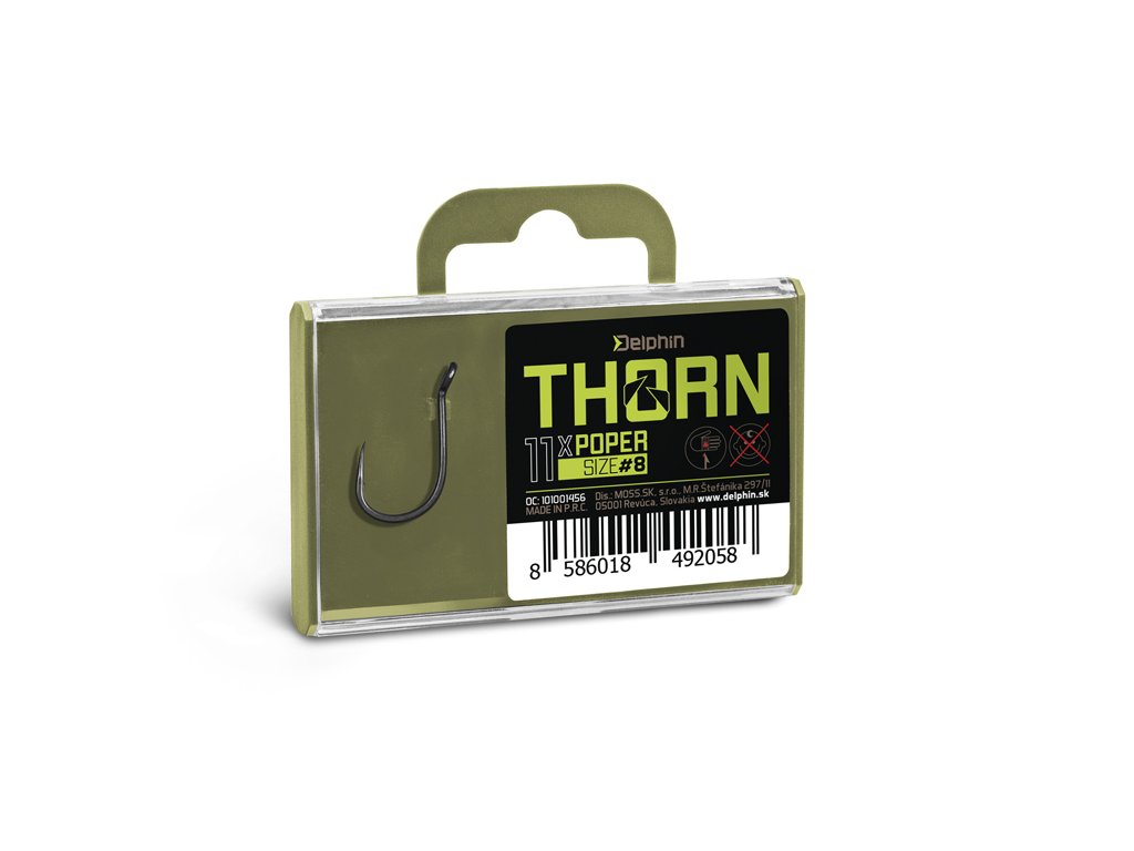 Delphin THORN je prémiová rada kaprárskych háčikov najvyššej kvality. Vďaka moderným technológiám, ktoré boli použité pri výrobe sú tieto háčiky synonymom nekompromisnej pevnosti a maximálnej ostrosti. Háčiky zo série THORN disponujú titanX povrchovou úpravou, čím nadobúdajú matný šedý povrch, ktorý je navyše dokonale hladký pre ľahké preniknutie do kaprej tlamy. TitanX sa stará taktiež o spevnenie a odolnosť celého háčika.Pomocou aplikovanej technológie Ultrapoint 4.8, bolo možné vytvoriť dlhší hrot, ktorý poskytuje priam neuveriteľnú ostrosť. Háčiky Delphin THORN sú balené v praktickej krabičke, v ktorej bude ich ostrie vždy dôkladne chránené. Na krabičke sa navyše nachádza držiak s očkom na zavesenie do predajní, ktorý je možné poľahky odstrániť odlomením bez akéhokoľvek nástroja, vďaka čomu krabička vo vašej výbave zaberie podstatne menej miesta.
