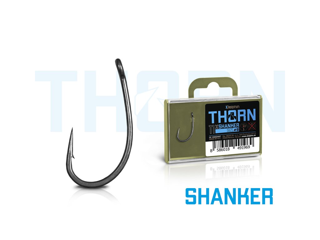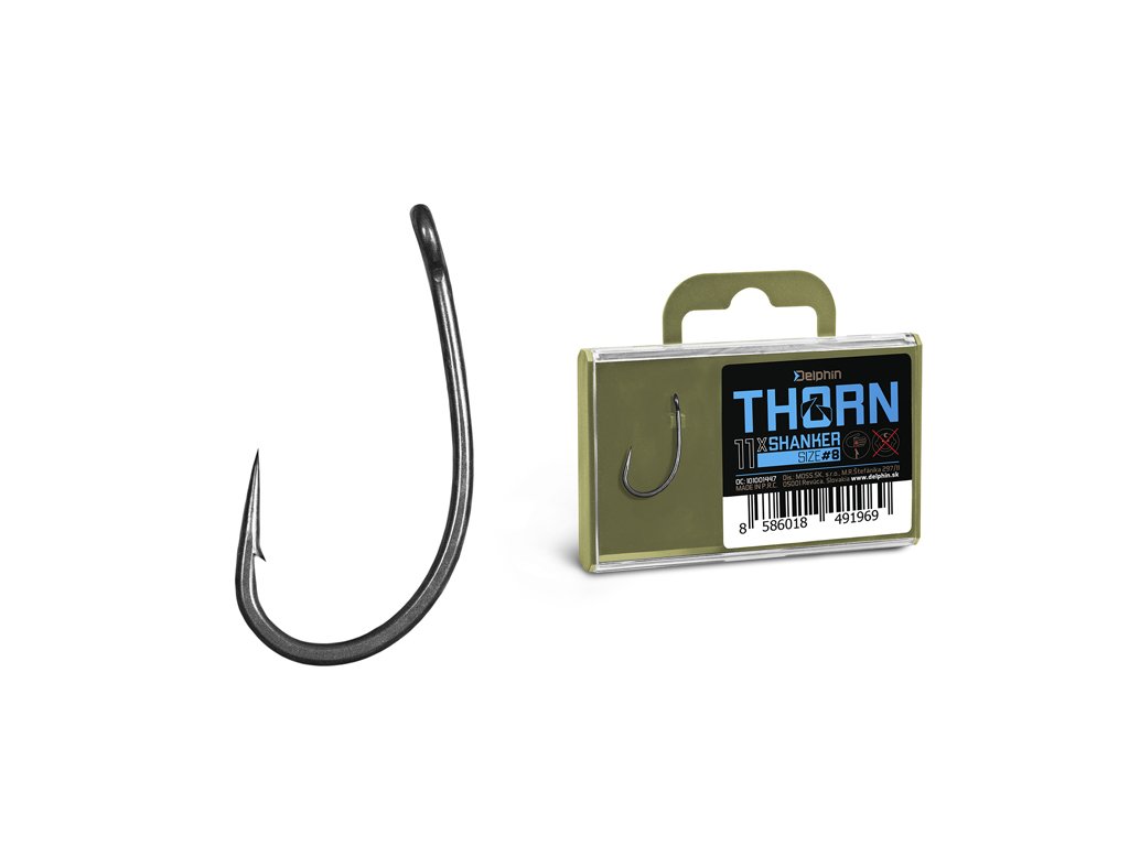Delphin THORN je prémiová rada kaprárskych háčikov najvyššej kvality. Vďaka moderným technológiám, ktoré boli použité pri výrobe sú tieto háčiky synonymom nekompromisnej pevnosti a maximálnej ostrosti. Háčiky zo série THORN disponujú titanX povrchovou úpravou, čím nadobúdajú matný šedý povrch, ktorý je navyše dokonale hladký pre ľahké preniknutie do kaprej tlamy. TitanX sa stará taktiež o spevnenie a odolnosť celého háčika.Pomocou aplikovanej technológie Ultrapoint 4.8, bolo možné vytvoriť dlhší hrot, ktorý poskytuje priam neuveriteľnú ostrosť. Háčiky Delphin THORN sú balené v praktickej krabičke, v ktorej bude ich ostrie vždy dôkladne chránené. Na krabičke sa navyše nachádza držiak s očkom na zavesenie do predajní, ktorý je možné poľahky odstrániť odlomením bez akéhokoľvek nástroja, vďaka čomu krabička vo vašej výbave zaberie podstatne menej miesta.