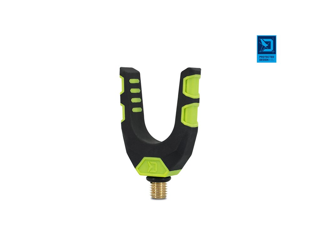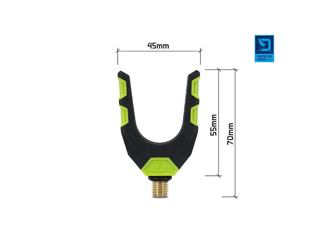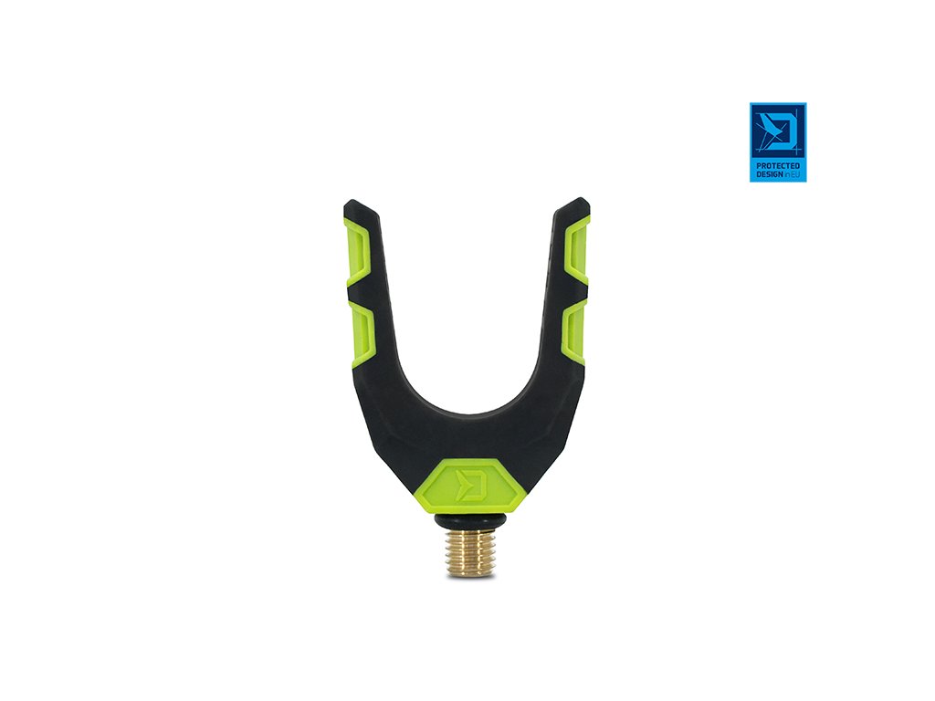 Zadný držiak prúta tvaru U, navrhnutý vo farbách inovatívnej feederovej série Delphin Reaxe. Držiak sa vyznačuje excelentným spracovaním a vyniká svojou robustnosťou a odolnosťou. Špeciálne navrhnutý tvar umožňuje uloženie prútov s rôznymi priemermi rukovätí. Povrch je potiahnutý pogumovaným materiálom, ktorý je extra šetrný k povrchu prúta a chráni ho pred poškodením. Držiak je vyrobený z odolných materiálov, takže sa ľahko nepoškodí a nepoškriabe. Univerzálny závit umožňuje uchytenie na všetky štandardné ramená, stojany a rázsošky. Na závitovej časti sa nachádza gumená podložka, ktorá zamedzuje otáčaniu držiaka.Technické parametre: