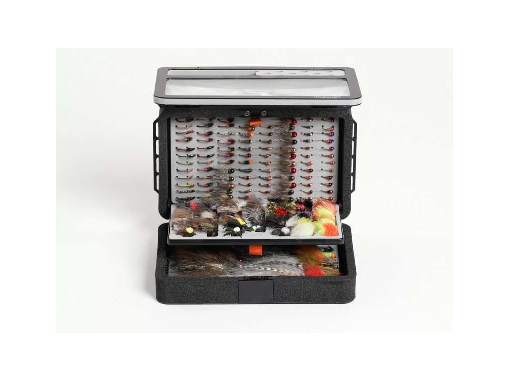 FlyVue™ od spoločnosti Smith Creek je systém hrudného batohu prémiovej kvality, ktorý je nabitý inteligentnými funkciami. Ak ste niekedy mali problém naviazať jemnú šnúrku na hrot počas pobytu pri vode, FlyVue vám pomôže (aj keď máte oči v poriadku a nenosíte okuliare). Integrovaná 3-násobná Fresnelova lupa FlyVue vám poskytuje veľkorysé zorné pole na viazanie aj tých najmenších nadväzcov bez tápania, čo vám ušetrí čas a problémy. Zapustené momentové závesy držia zväčšovaciu šošovku a zásobníky na muchy v pevnom uhle, kým nie ste pripravení ich zatvoriť. Špecializované vnútorné závesy zásobníkov umožňujú vložiť zásobníky na mušky v 4 rôznych polohách, zatiaľ čo dodatočná minipatch na veku pojme až 9 ďalších mušiek na pohotové použitie. Zadná doska FlyVue má po stranách otvory na rebrovanie, ktoré vám umožnia pripevniť malé príslušenstvo, ak si to želáte, zatiaľ čo malá spodná spona sa pripevní k veste alebo bunde, aby sa zabránilo tomu, že sa FlyVue™ bude hojdať od vášho tela, keď sa nakloníte. FlyVue™ má na výber z 5 rôznych typov zásobníkov, do ktorých sa zmestia doslova stovky mušiek a do ktorých uložíte všetko, čo potrebujete na deň strávený pri vode, bez toho, aby vás zaťažovali.