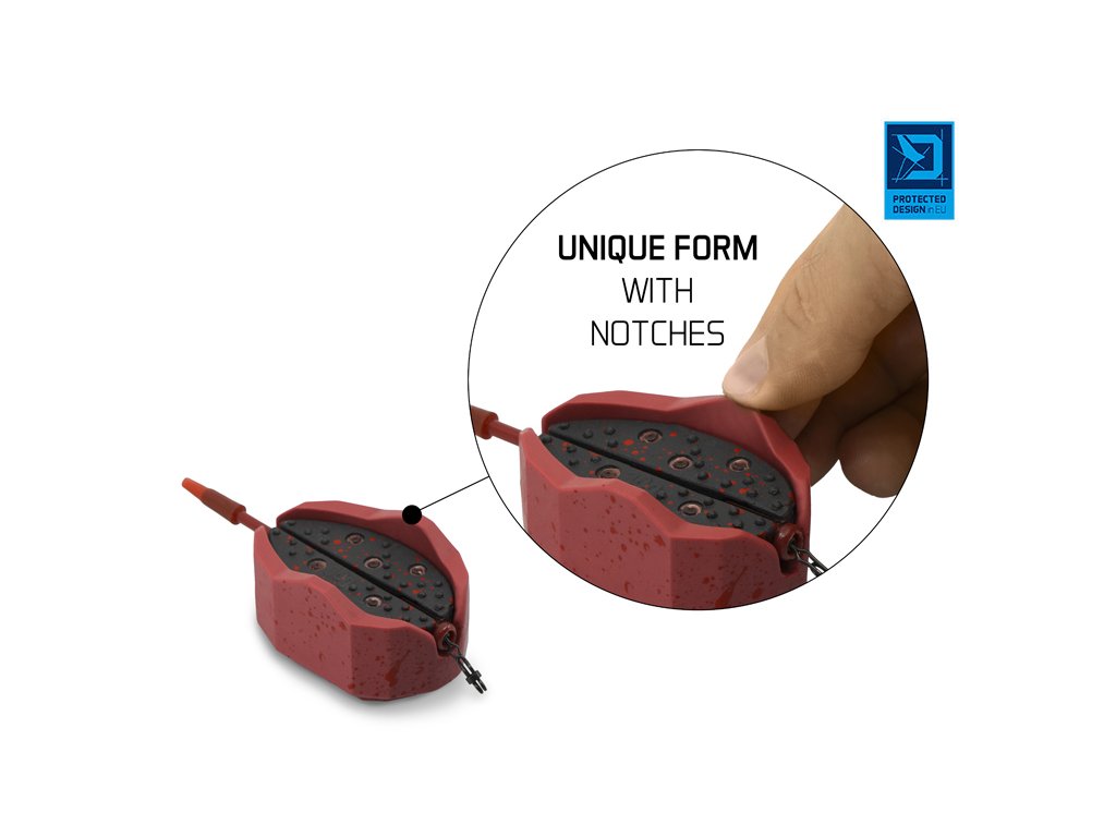 Dômyselne, do detailov prepracovaná forma, s ktorou bude naplnenie krmítka a zároveň vytvorenie dokonalej prezentácie otázkou krátkej chvíle. Vďaka poddajnému materiálu je možné kontrolovať vynaložený tlak na obsah vo vnútri a tým dosiahnuť variabilnú rozpadavosť kŕmenia vo vode.Zároveň je možné formu jednoduchšie odňať z krmítka vďaka poddajným stenám, ale najmä dvom výstupkom po bokoch, ktoré výrazne uľahčujú manipuláciu. K ľahšiemu vyberaniu naplneného krmítka slúži aj spodná strana s drážkami pripomínajúcimi odtlačok prsta a logom Delphin uprostred, čím vás presne nabáda k miestu zatlačenia, pre čo najjednoduchšie vybratie.
