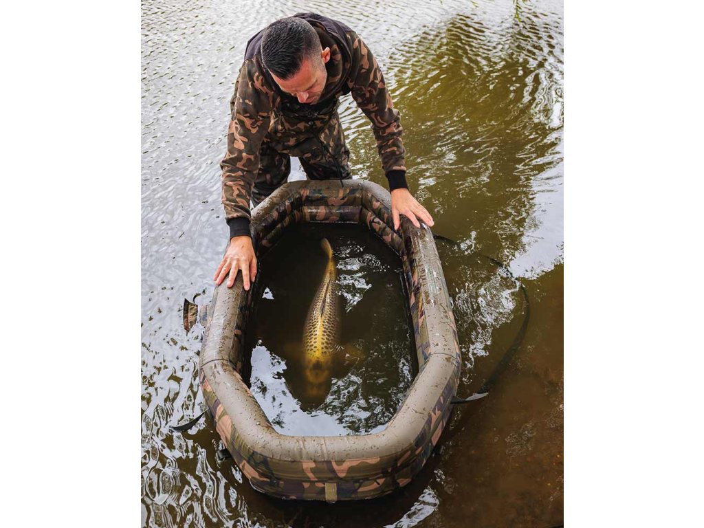 - Vnitřní matraci lze vyjmout a umožnit tak přechodné uchování ryby na síťovaném dně podlážky ve vodě při focení.