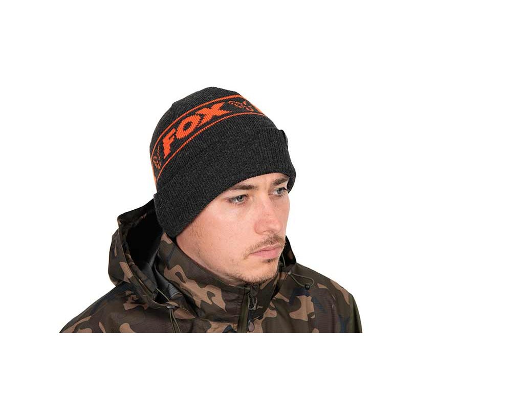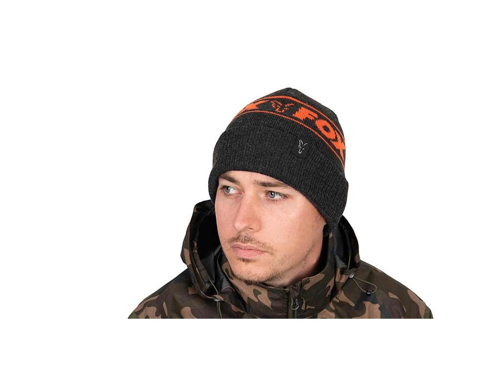 - Čierna melírovaná čiapka s bambulou s oranžovým emblémom Fox