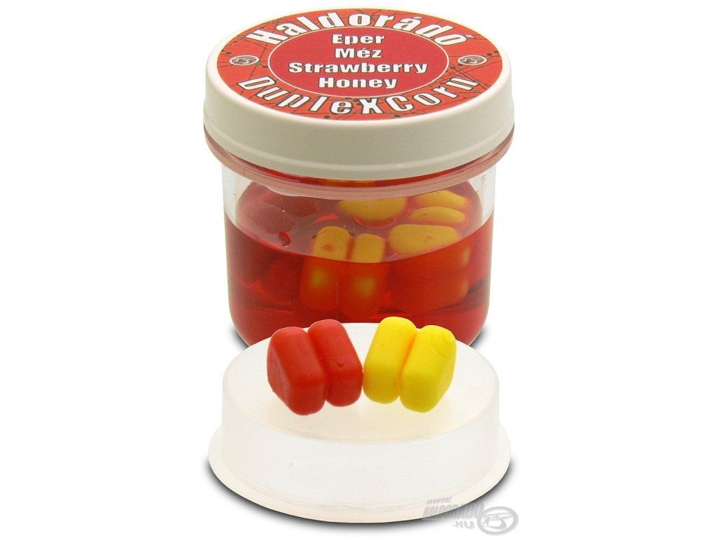 DupleXCorn je vylepšená verzia gumovej kukurice SpéciCorn, ktorá vychádza z potrieb zákazníkov. Niekedy je bežné jedno jadro gumovej kukurice príliš malé, zatiaľ čo veľké jadro Mega SpéciCorn je príliš veľké. Ideálnou veľkosťou medzi nimi je dvojitá SpéciCorn. Mnohí ľudia už použili dvojitú SpéciCorn, ale navliekanie jednotlivých zŕn je veľmi ťažkopádne. Aj to sme vyriešili a ponúkame hotovú dvojzrnnú kukuricu, podávanú v bežnej ochutenej nádobe s aromatickým uzáverom. Vynikajúca schopnosť plávať, intenzívna, CHUTNÁ chuť a vôňa a robustnosť odlišujú tento výrobok od podobných napodobenín. Pohár, ktorý obsahuje 8 dvojitých kukuričných zŕn jemnej chuti, je veľmi účinný, keď sa ponúka na špicu nástrahy, a ak sa nestratí, dokáže uloviť desiatky rýb na jedinú nástrahu. Na konci rybačky sa odporúča vložiť nástrahu späť do nádoby, aby sa znovu nabila a nasiakla jedinečnou arómou. Takto môže malá nádobka vydržať celú sezónu! Vhodná najmä pre kaprársku techniku method-feeder, pri ktorej možno naplno využiť všetky výhody DupleXCorn. Je to pružná, odolná nástraha, ktorej ďalšou výhodou je, že nie je zraniteľná a malé ryby ju nemôžu roztrhnúť. Je odolná aj voči trpasličím sumcom a je skvelou nástrahou pre väčšie ryby. k dispozícii v 6 víťazných príchutiach. Variant Strawberry + Honey obsahuje 4 červené dvojité kukuričné jadrá a 4 citrónovo žlté dvojité kukuričné jadrá.Dodatočné parametre