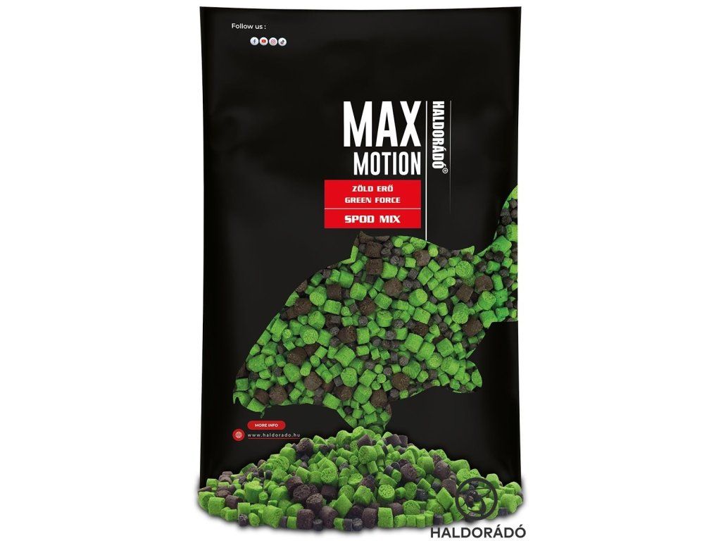 Zmesi Spod sa používajú predovšetkým na formulovanie krmív a mali by sa zavádzať pomocou kŕmneho kotúča. MAX MOTION Spod Mix je zmes peliet rôznych veľkostí a zloženia, ktoré môžu byť ďalej ochutené príchuťami z radu MAX MOTION alebo prípadne kaprovým sirupom. Vďaka premenlivej intenzite rozpúšťania a uvoľňovania arómy pelety rýchlo rozvíjajú svoj vábivý účinok, čo z nich robí dobrú alternatívu ku ktorémukoľvek členovi tohto sortimentu na začatie kŕmenia. K dispozícii je sedem príchutí javor a banán, kukurica Champion, sladký ananás, španielsky lieskový orech, pikantná červená pečeň, veľká ryba a zelená sila.Dodatočné parametre