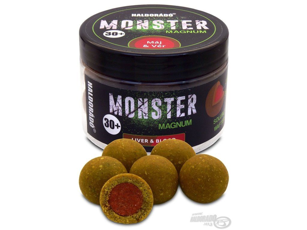Rad MONSTER nie je známy svojimi príjemnými vôňami, ktoré si ľudský nos môže vychutnať, ale jeho chytľavosť je nesporná! Okrem návnad a peliet je jasné, že tento rad je dostupný aj vo forme príchutí a od roku 2024 budú návnady Magnum dostupné vo veľkostiach 30+ a 35+! MONSTER Magnum 30+ má všetky výhody rozpustných aj varených návnad, pretože ide o návnadu s vareným stredom a rozpustnou vonkajšou vrstvou! Vnútorné jadro je varená nerozpustná nástraha s priemerom 20 mm. Vonkajšia vrstva je hrubá 5 mm a neustále sa rozpúšťa a uvoľňuje lákavé príchute. Vnútorná, varená časť môže vydržať až 72 hodín, zatiaľ čo vonkajšia časť sa rozpúšťa 5-8 hodín (v závislosti od teploty vody). Veľmi atraktívna, veľmi výkonná nástraha, odporúčaná najmä na lov rýb pod vysokým tlakom, často lovených, opatrných, kapitálnych rýb. Je to jedna z "tajných zbraní" lovu veľkých kaprov na prívlač v Balatone! K dispozícii v šiestich lovných variantoch. Liver & Blood má červené semeno s hnedou rozpustnou vrstvou, Squid & Blueberry má čierne semeno s ružovou rozpustnou vrstvou, Hot Mango má oranžové semeno s bielou rozpustnou vrstvou a Tuna & Squid Larva má hnedé semeno s bordovou vonkajšou vrstvou a Tuna & Squid Larva má hnedé semeno s bordovou vonkajšou vrstvou.Dodatočné parametre