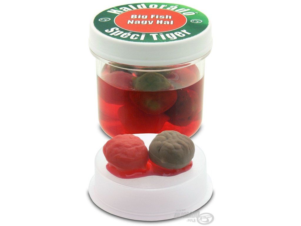 Dostali sme veľa listov o Haldorado SpéciTiger, gumovej imitácii tigrieho orecha, keďže rybári po uvedení SpéciCorn na trh videli aj potenciál "umelých nástrah". V reakcii na dopyt sme ju vyrobili aj v šiestich rôznych príchutiach s 3,5-násobnou vztlakovou silou oproti tradičnej SpéciCorn. Tieto pružné, veľké nástrahy sa udržia v každej situácii! Odolajú aj tým najžravejším malým rybám, dokonca ani trpasličí ostriež ich nedokáže "vyrvať" zo svojich vlasových línií. Ich odolnosť vám získa čas a môžete si byť istí, že skôr či neskôr lákavú arómu ucítia aj veľké ryby plávajúce v blízkosti! Základná farba návnady je tu hnedá, v každej nádobke sú štyri zrnká, ktoré boli doplnené špeciálnymi farbami podobnými Mega Corn. V nádobe sa nachádzajú hnedé a červené gumené nástrahy.Dodatočné parametre