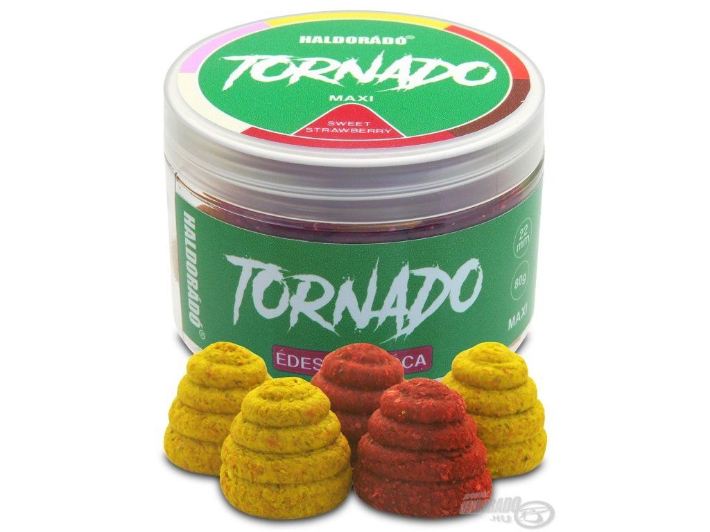 TORNADO MAXI si zachováva jedinečný tvar nástrah TORNADO, ale na rozdiel od svojich predchodcov je to potápavá, rozpustná nástraha. Vďaka zväčšenej veľkosti 22 mm je optimalizovaná pre selektívnych lovcov veľkých kaprov, ale môže byť riešením aj pre feedristov, ktorí hľadajú kapitálne ryby, keď ide o vyberanie veľkých rýb. Pri rozpúšťaní priebežne uvoľňuje chuťové a pachové zlúčeniny, ktoré rýchlo prilákajú ryby. Každá nádoba TORNADO MAXI obsahuje dve rôzne farby návnady, čo vám dáva dostatok priestoru na experimentovanie. Sladké jahody sú žlté a červené, Rokfort Cheese, N-maslo a ananás, Mango oranžové a žlté, Perník citrón žltý a hnedý, Cesnak a mandle biely a žltý, Punč a mäta ružový a žltý, zatiaľ čo Chobotnica a broskyňa oranžová a ružová, Sipi1 citrón žltá a biela a Sipi2 oranžová a biela sú zrnká.Dodatočné parametre