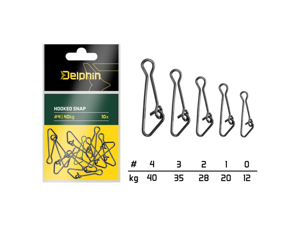 Delphin Hooked snap je karabínka určená na výrobu rozličných koncových zostáv. Vďaka zatváraciemu mechanizmu umožňuje ľahkú a rýchlu výmenu rozličných komponentov ako nástrahy, krmítka či záťaže. V ponuke päť rôznych veľkostí.Dodatočné parametre