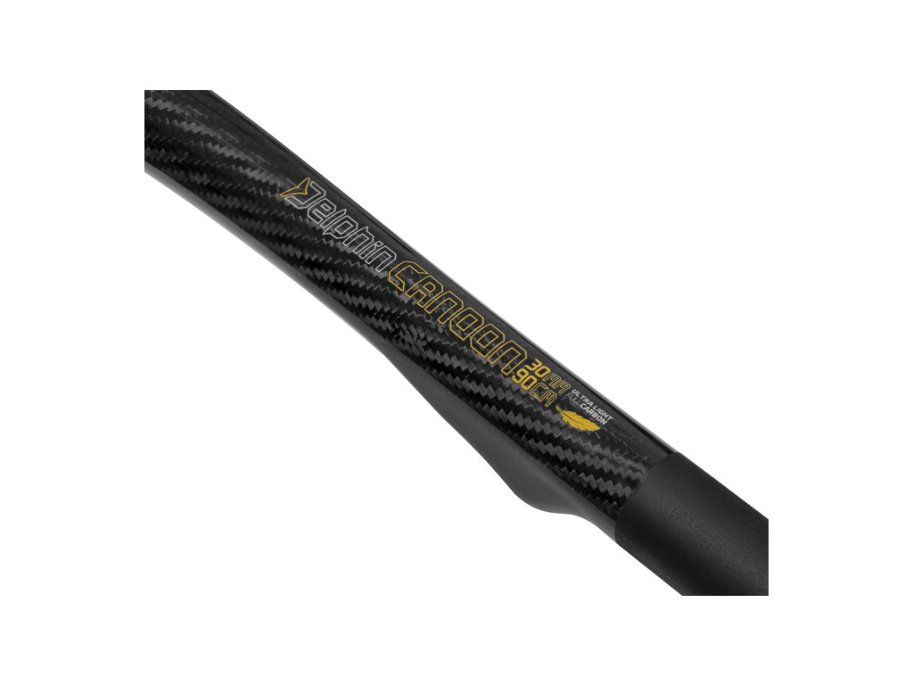 Veľké úlovky si žiadajú špičkové vybavenie! Práve takým je vrhacia tyč / kobra CANOON od značky Delphin. Tento prémiový produkt je vyrobený z vysokej triedy carbon-u, čo sa jednoznačne podpisuje na jej ultra nízkej hmotnosti. Pri dĺžke 90cm a priemere otvoru 30mm váži v priemere len cca 85g! Vďaka tomu výrazne odbremení vaše rameno pri zakrmovaní a umožní tak nahadzovať dlhšiu dobu, než ste boli doteraz zvyknutý. Klasický, no proporčne vyvážený tvar CANOON-u navyše významne predĺži aj vzdialenosť, na ktorú je možné zakrmovať. Nad rukoväťou sa nachádza plniaci otvor pre rýchlejšie vkladanie nástrahy. Za výkonovými parametrami však nezaostáva ani vizuálna stránka! Telo vrhacej tyče je precízne vypracované a pod vrstvou klavírneho laku sa nachádza 3D textúra carbon-u v spojení s decentnou grafikou. Samotná rukoväť je pokrytá čiernou matnou protišmykovou vrstvou. Vrhacia tyč má navyše pre transport v balení aj EVA záslepku otvoru a zabalená je v praktickom neoprénovom puzdre, ktoré dostávate k tyči grátis.Technické parametre: