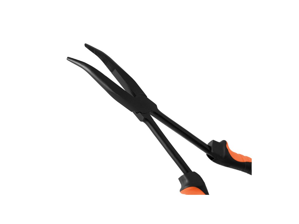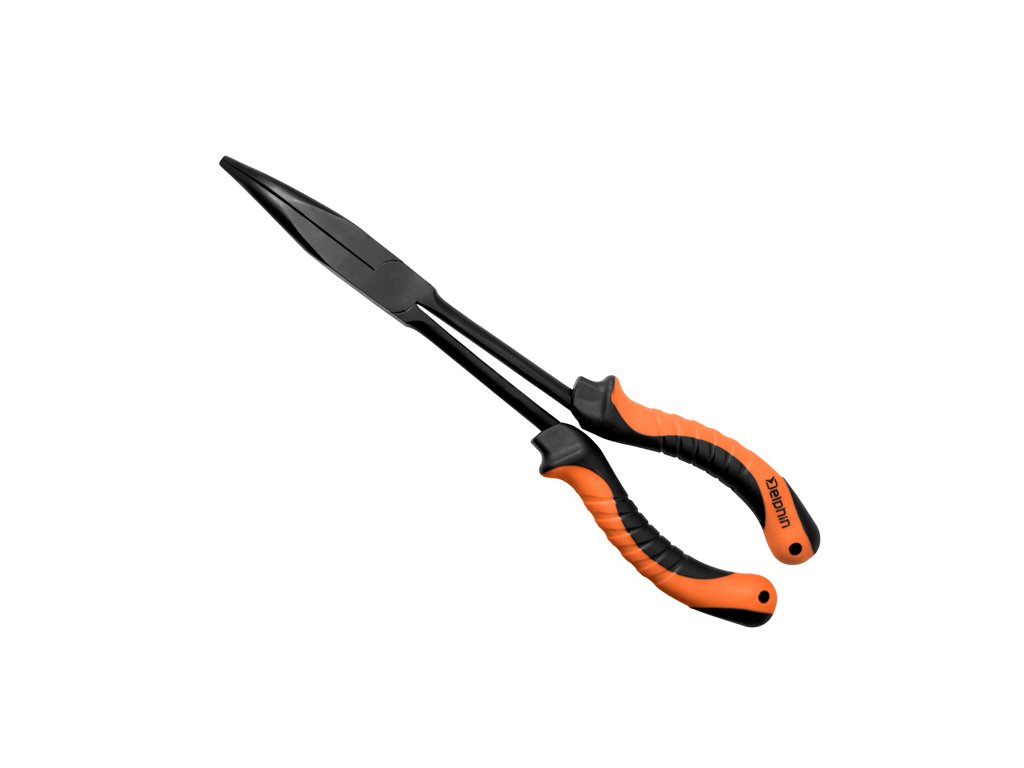 Delphin LOOONG sú dlhé kliešte so zahnutou čeľusťou. Sú určené pre vyslobodzovanie háčikov z tlám tých najväčších dravých rýb, v prípadoch, kde nato klasický peán už nestačí. Ich dĺžka je až 28cm. Vnútorna strana ramien klieští poskytuje dostatočne drsnú plochu pre uchopenie aj veľkých dvojháčikov a trojháčikov. Sú vyrobené z ocele s vysokým podielom uhlíka a ich obe rúčky sú vybavené plastom oranžovo čiernej farby, ktoré sú dobre viditeľné za každých podmienok a dobre padnú do ruky. Na oboch ramenách rukoväte sa nachádzajú otvory na prevlečenie šnúrky. S našimi kliešťami LOOONG viete ulovenú rybu rýchlo a bezpečne zbaviť uviaznutých háčikov.Dodatočné parametre