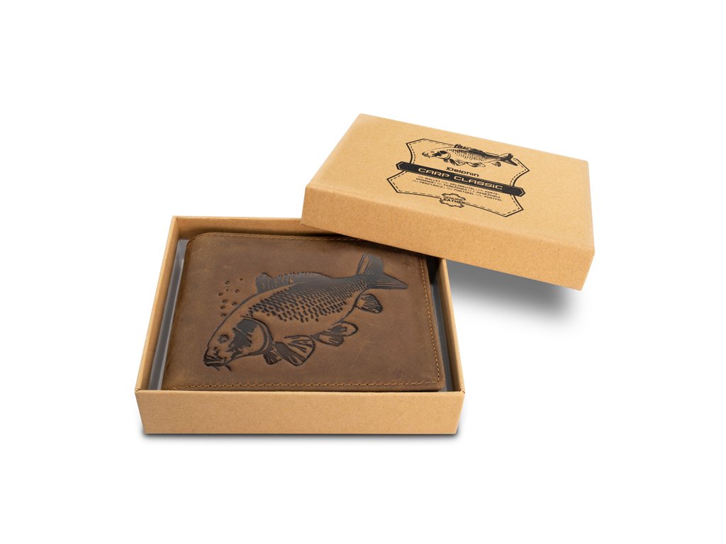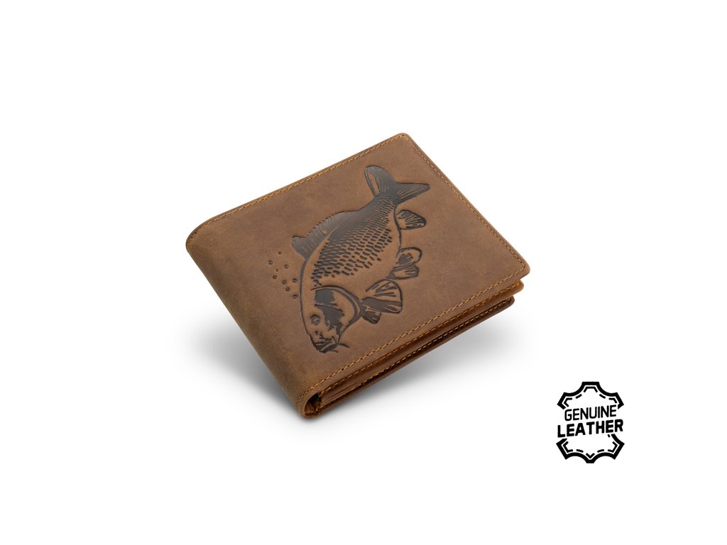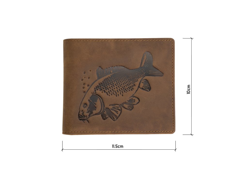 Štýlová kožená peňaženka vylepšená klasickým motívom kapra, ktorá bezpečne uchová vaše doklady aj hotovosť. Obsahuje niekoľko priečinkov na platobné a zákaznícke karty, zapínacie vrecko určené pre mince, prípadne žetóny a samozrejme nechýbajú dva priečinky pre uloženie bankoviek.Peňaženka je vyrobená z pravej kože tmavohnedej farby, vďaka čomu sa vyznačuje kvalitou, odolnosťou a príjemne sa drží v ruke.