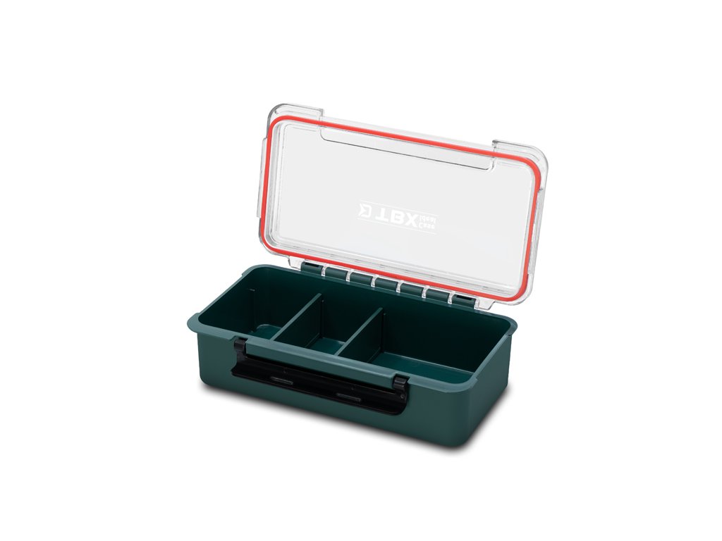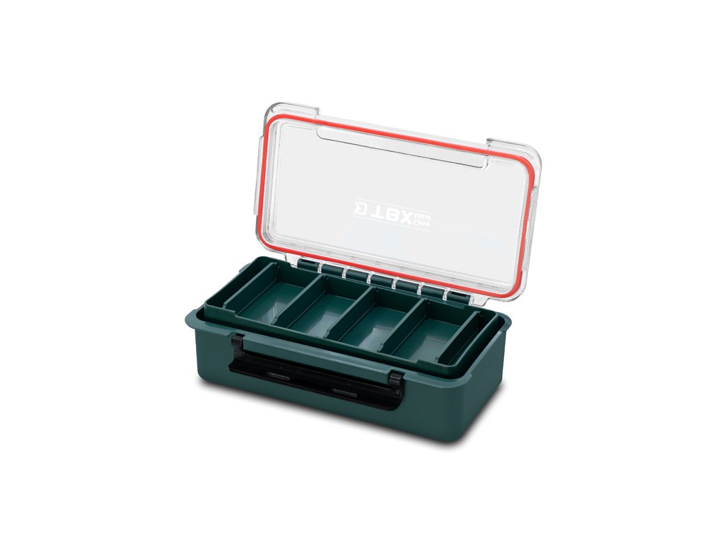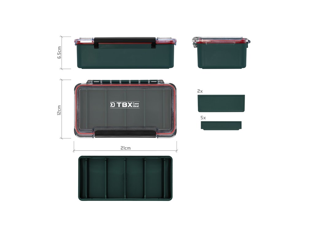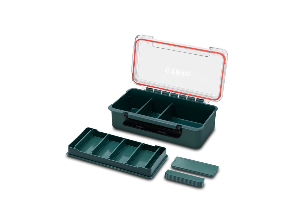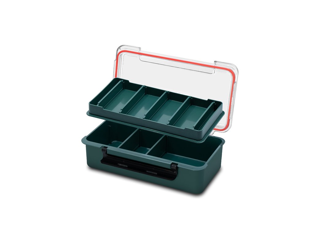 Vo vnútri sa nachádza odnímateľná polička ktorá rozdeľuje box na dve časti. Polička je rozdelená až piatimi odnímateľnými prepážkami, vďaka ktorým si vnútorné usporiadanie prispôsobíte presne podľa svojich potrieb. Hlavný úložný priestor je rozdelený dvoma odnímateľnými prepážkami. Pokiaľ sa rozhodnete tieto prepážky vybrať, vytvoríte si ešte väčší priestor na odloženie vášho rybárskeho príslušenstva. Transparentné veko umožňuje mať vždy dokonalý prehľad o obsahu, zatiaľ čo gumové tesnenie po celom obvode a pevný plastový klip zaručujú bezpečné uzatvorenie aj počas transportu. Vďaka gumovému tesneniu je krabica vodotesná.