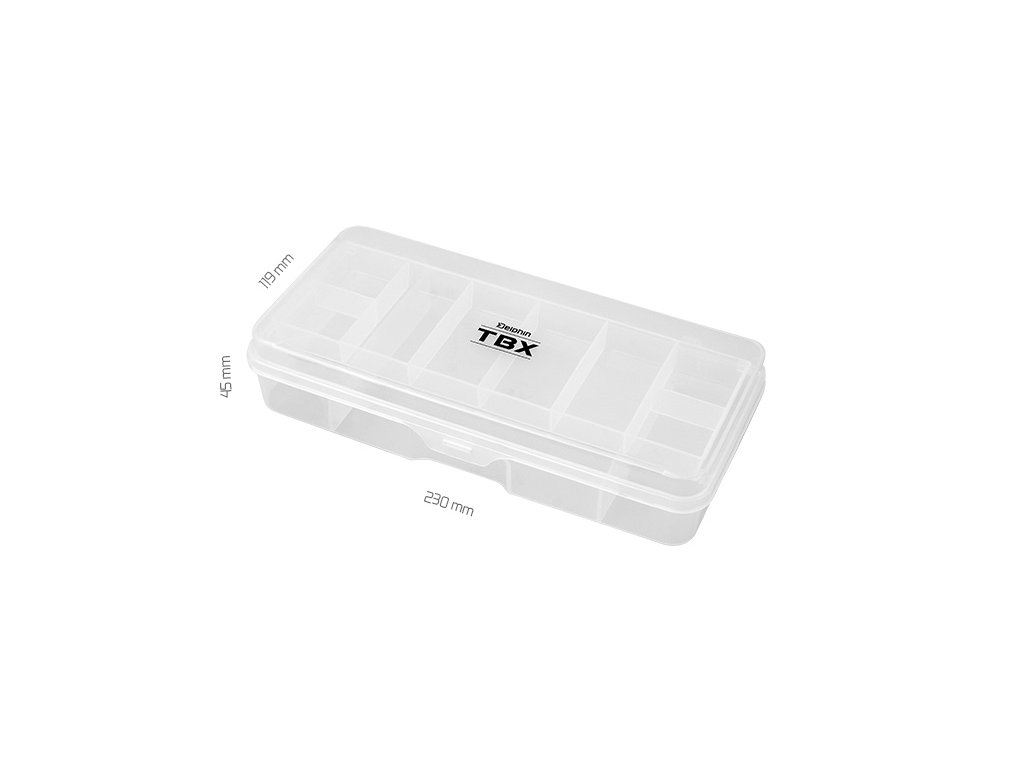 TBX ONE je rada multifunkčných krabičiek určených na uloženie rybárskeho príslušenstva. Vyrobené sú z transparentného plastu, takže máte vždy dokonalý prehľad o uložených veciach vo vnútri krabičky. Rada TXB ONE je vybavená praktickými klipmi z transparentného plastu.Technické parametre: