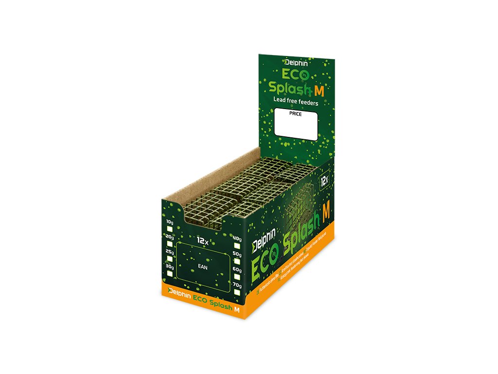 Revolučné feederové krmítko, pri ktorom sa olovo stáva minulosťou.Pri krmítku ECO Splash sme klasickú olovenú záťaž nahradili oceľovou, vďaka čomu nepredstavuje takmer žiadnu potencionálnu záťaž pre životné prostredie. To je jednoznačne najväčšou prednosťou tohto produktu. Okrem toho že je ekologické, je 100% funkčné a pri nahadzovaní či vyťahovaní z vody sa správa rovnako dobre ako klasické krmítka, na ktoré ste boli doteraz zvyknutí. Samotný košík je vyrobený z pevného drôtu, ktorý zabraňuje jeho preliačeniu počas plnenia. Košík aj závažie sú navrhnuté v jedinečnom kamuflážovom dizajne, čím krmítko excelentne splynie s dnom.