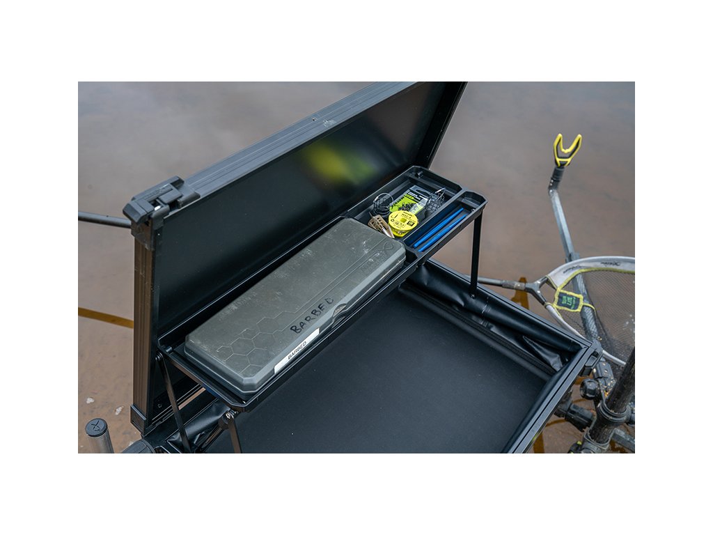 - Unikátna skladacia polica navrhnutá na bezpečné uloženie drobných predmetov počas lovu alebo prepravy