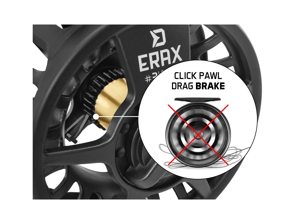 Delphin ERAX celokovový muškársky navijak so širokou a z oboch strán vyvýšenou cievkou pre lepšie ukladanie podkladovej šnúry. Čierna matná farba nespôsobuje odlesky a tak nebudete pri vode plašiť ryby neželaným odrazom.Veľkou výhodou muškárskeho navijaku ERAX je citlivá brzda, ktorá je ukrytá v puzdre navijaka, kvôli odolnosti voči piesku a iným neželaným nečistotám, najmä pri namočení navijaku do vody počas lovu. Brzda je opatrená perkovým systémom, vďaka čomu aj pri rýchlych výpadoch nevznikne nechcené odmotanie šnúry a tým sa zamedzí rôznym uzlom, ktoré by mohli spôsobiť stratu úlovku pri zdolávaní.