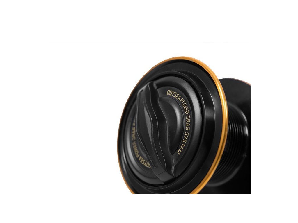 Delphin ODYSEA je masívnym navijákom s veľkokapacitnou kovovou cievkou. Na jedno otočenie kľučky, dokáže ODYSEA navinúť vyše 1m vlasca či šnúry. Je predurčený pre lov na väčšie vzdialenosti. ODYSEA je osadená “Power Drag” brzdou, ktorá dokáže úplne zabrzdiť cievku na jedno pootočenie vrchnej brzdy. V praxi to znamená, že vhodným nastavením brzdy pred lovom, dokáže rybár počas zdolávania pracovať v rozmedí “štvrť” otáčky brzdy, čo určite každý ocení pri náhlych výpadoch ryby. 34mm brzdové podložky garantujú plynulý rozbeh brzdy bez akéhokoľvek zadrhávania. Telo navijáka je vyrobené z tvrdeného plastu. Vnútorné pretvarovanie bolo navrhnuté tak, aby ani pri vysokom zaťažení nemal rybár pocit, že sa mu telo navijáka “ohýba”. Vnútro ODYSEY je postavené na spoľahlivom šnekovom prevode. Jemný chod zabezpečuje šesť ložísk s nasledujúcim umiestnením : 2ks na vnútornom ozubení, 2ks pre zaistenie a hladký chod šnekového hriadeľa, dve masívne ložiská na hlavnej osi, plus siedme “jednocestné” ložisko. Súčasťou každého navijaka je tzv.servisný balíček, ktorý obsahuje “Power Drag” brzdu a náhradnú aretačnú skrutku rukoväte.Pre tých, ktorí vyžadujú extrémnu silu brzdy je možné dokúpiť originálne karbónové podložky, ktoré je nutné zameniť v kovovej cievke za filcové podložky. Výmena je veľmi jednoduchá a nezaberie viac ako 2 minúty času. Na druhej strane výmenou podložiek za karbónové získate navyše ďalšie kilogramy v sile brzdy a 100% spoľahlivosť aj pri dlhotrvajúcom daždi. V ponuke je tiež plytká cievka pre tých, ktorí sú zvyknutí používať veľmi tenké hlavné vlasce.