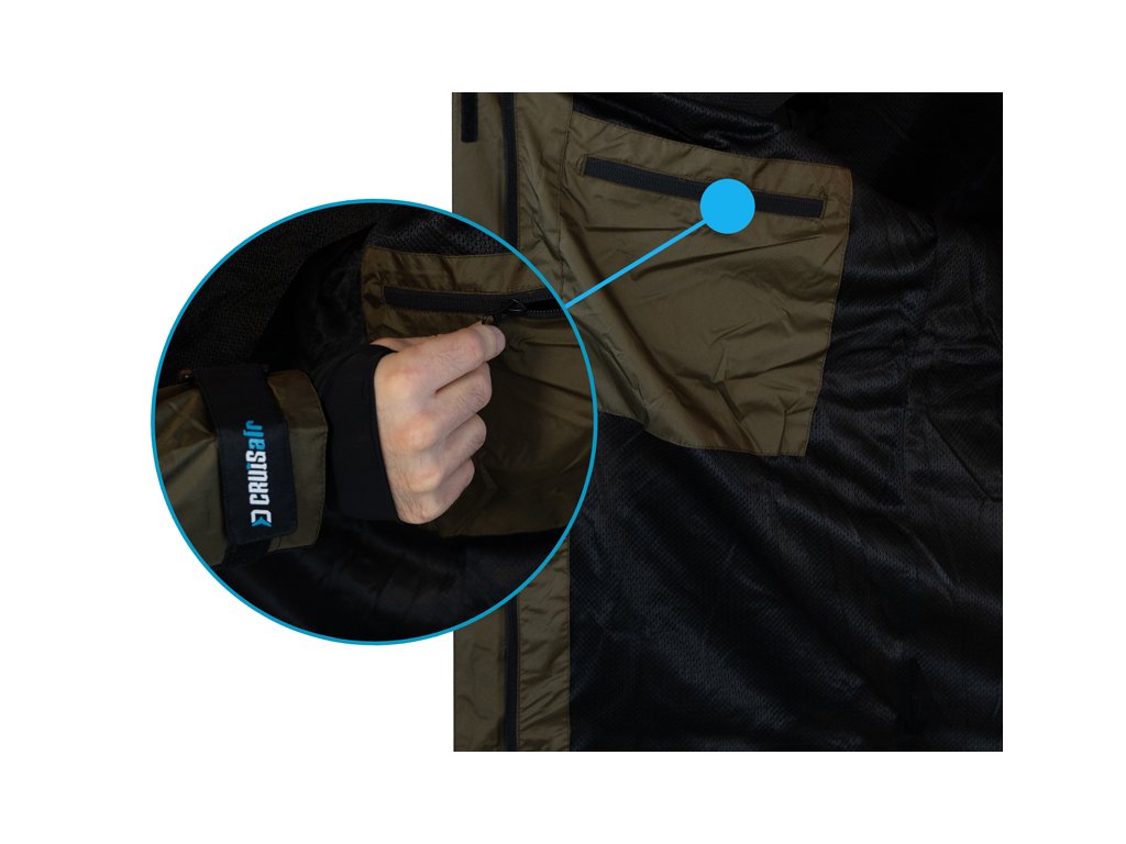 Vnútorná strana bundy je opatrená sieťovinovou látkou, ktorá zamedzuje dotyku kože s vonkajším materiálom. Okrem toho je na dotyk veľmi príjemná čím zvyšuje pohodlie počas nosenia. Vo vnútri je aj veľmi praktické zipsovateľné vrecko, vhodné napríklad na doklady, či iné cennosti. Dve vrecká sa nachádzajú aj na vonkajšej strane bundy, pričom disponujú vodeodolnými zipsami, vďaka čomu nehrozí zatečenie vody do vnútra. Zapínanie bundy je zabezpečené pomocou odolného zipsu, ktorý je prekrytý pásom tkaniny so suchými zipsami. Rukávy sú na zápästiach regulovateľné pomocou popruhov so suchým zipsom a teda je možné si ich poriadne utiahnuť a minimalizovať vtekanie vody po rukách. V spodnej časti bundy sa nachádzajú po bokoch gumičky umožňujúce zatiahnutie a prispôsobenie podľa Vašich potrieb. Najviac namáhané časti sú prekryté čiernou tkaninou odolnou voči poškodeniu a fyzickému zaťaženiu. Samozrejmosťou na bunde je kapucňa, sťahovateľná dvoma gumičkami. Kapucňu je navyše možné odopnúť pomocou zipsu a bundu tak využívať aj bez nej.