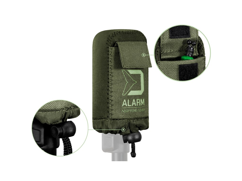 Delphin ALARM je produkt slúžiaci na ochranu vašich signalizátorov počas transportu voči mechanickému poškodeniu a dažďu. Je vyrobený z neoprénu, vďaka čomu sú jednotlivé steny dostatočne hrubé a mäkké nato, aby spoľahlivo ochránili elektronické signalizátory pre obitím, či iným znehodnotením. V prednej časti sa nachádza praktické vrecko na uloženie napríklad závesných signalizátorov, prípadne náhradných bateriek.Šnúrka so sťahovacím systémom umožňuje stiahnuť spodnú časť tesne k rázsoške, vďaka čomu obal nemôže zo signalizátora skĺznuť ani pri prevrátení dolu hlavou.