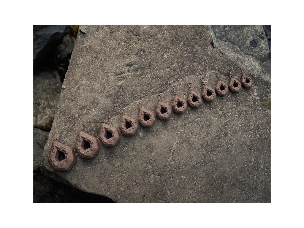 Je inovatívna záťaž dizajnovaná tímom značky Delphin, vhodná pri love na odhod na členitom dne, alebo pri love na tečúcich vodách. Vďaka jedinečnému hranatému tvaru bolo možné vytvoriť kompaktnejšiu záťaž, ktorá má pri menších vonkajších rozmeroch rovnakú hmotnosť ako bežne predávané olová podobného typu. To zaručí výborné nahadzovacie vlastnosti a rýchle klesanie ku dnu. Pre docielenie čo najdlhších a najpresnejších hodov je navyše spodná časť záťaže rozšírená, aby sa tu koncentrovalo viac hmoty a tak predlžuje Vaše hody o ďalšie dôležité metre! Výstupky na hlavných plochách záťaže eliminujú kĺzanie po dne. Otvor v strede záťaže umožňuje rýchlejšie klesanie montáže vodným stĺpcom. Povrch záťaže je chránený farbou v prírodných odtieňoch hnedej s čiernymi fŕkancami, čo dokonale kamufluje jej prítomnosť na dne. Zväčšené očko na obratlíku umožňuje jednoduchšie a rýchlejšie upevnenie záťaže na montáž.PROTECTED DESIGN- Tento produkt bol kompletne navrhnutý dizajnérmi značky Delphin. Jeho dizajn a technické riešenie sú natoľko unikátne, že je registrovaný a chránený na území celej Európskej únie.
