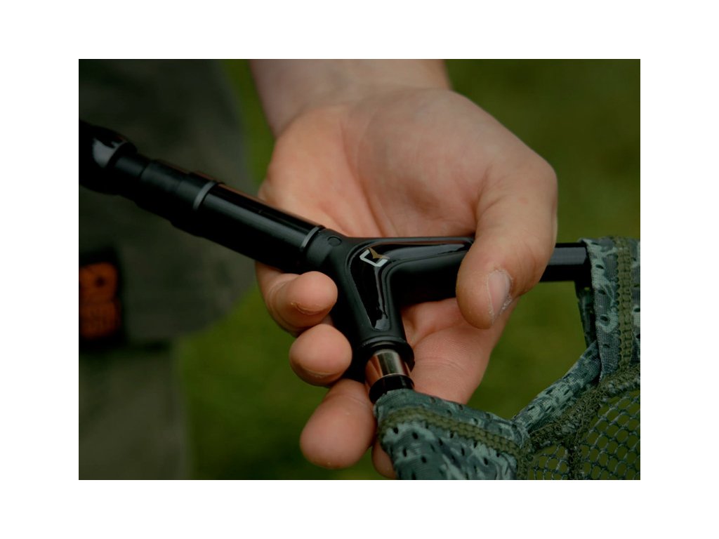 Hlava podberáku je tvorená dvomi teleskopickými ramenami, ktoré sa po vytiahnutí dokonale zafixujú, takže môžete byť bez obáv z nechceného zasúvania. Teleskopický mechanizmus nielenže rapídne znižuje transportné rozmery, ale aj zjednodušuje samotné zasunutie a vysunutie ramien do konektora, čím sme docielili oveľa jednoduchšiu manipuláciu s podberákom – napríklad pri prenášaní úlovku do podložky.