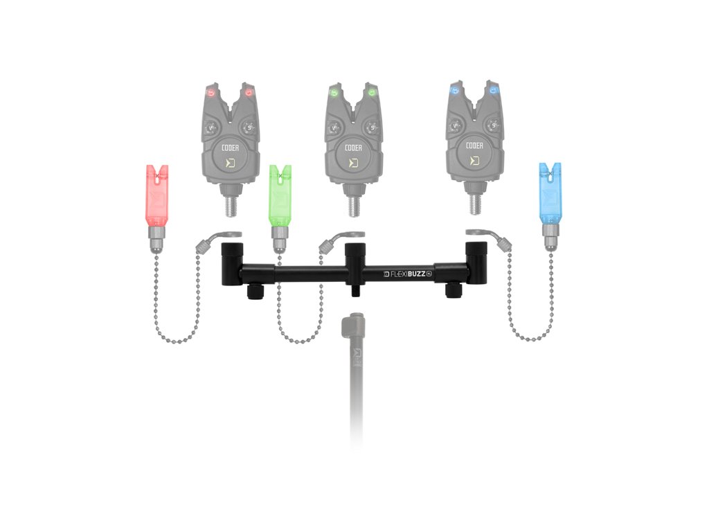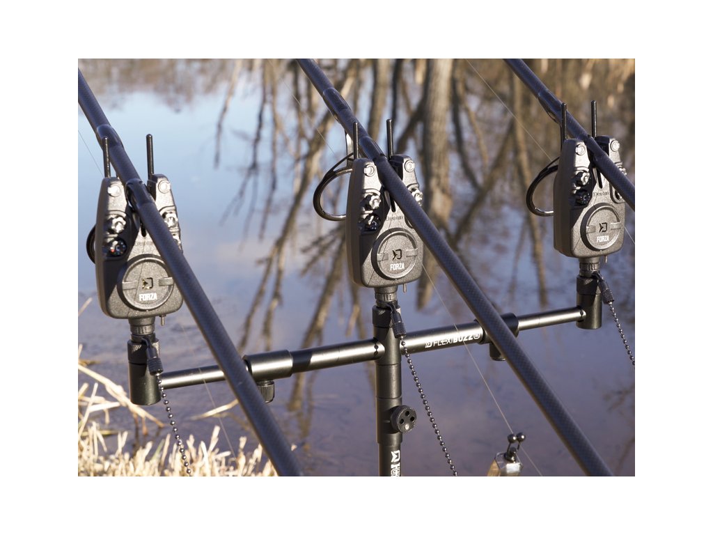 Rozťahovacia hrazda na prúty s univerzálnym závitom, kompatibilná s väčšinou rázsošiek dostupných na trhu. Jednotlivé ramená sú výsuvné, a teda je možné si šírku hrazdy prispôsobiť podľa svojich potrieb, napr. podľa veľkosti navijakov. V obľube je tiež roztiahnutie prednej hrazdy a vytvorenie vejárového rozloženia prútov, pri ktorom špičky smerujú mierne od seba.Výsuvné ramená sú zo spodnej časti zrezané do roviny, takže po utiahnutí poistných skrutiek perfektne držia na mieste a nepretáčajú sa. Vrchné závity obsahujú matice umožňujúce utiahnutie každého typu signalizátora alebo rohatiniek presne do roviny s hrazdou. FlexiBUZZ je vyrobená z pevného hliníka, s odolnou povrchovou úpravou, ktorá bola dosiahnutá pomocou práškovej čiernej farby.