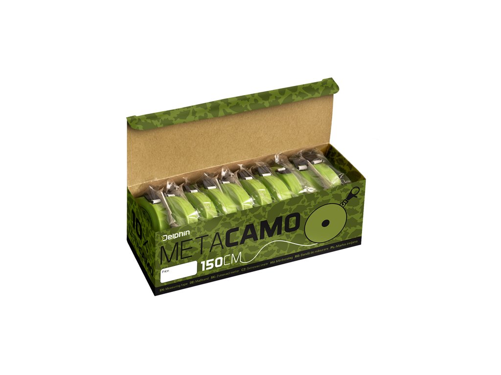 Štýlový meter, ktorý by nemal chýbať vo výbave žiadneho priaznivca značky Delphin. MeTa Camo je jedinečný meter, určený najmä pre kaprárov, ktorý v sebe skrýva niekoľko vychytávok. Na prvý pohľad zaujme efektným zeleným dizajnom s čiernymi doplnkami a grafikou v carpath camo štýle. Na vrchu disponuje praktickou karabínkou, ktorá umožňuje jeho upnutie na oblečenie, prípadne na iné miesto, kde ho budete mať vždy poruke. Koniec samotného metra je opatrený praktickým držiakom, ktorým pásmo jednoducho vysuniete. Pokiaľ chcete, aby pásmo “schovalo“ späť, stačí stlačiť čierne tlačidlo na boku, čím poľahky dôjde k jeho zrolovaniu. Celková dĺžka metra až 150 cm vám umožňuje zmerať aj tie najväčšie úlovky. Na rozdiel od bežne predávaných metrov je na metri MeTa aj z druhej strany pásma uvedená stupnica v centrimetroch, čiže nikdy nedôjde k zámene s inými jednotkami.Navyše je veľkoobchodné balenie metra prispôsobené pre ľahký predaj z pultu. Metre sú totiž balené v plnofarebných krabiciach po 10 kusov.