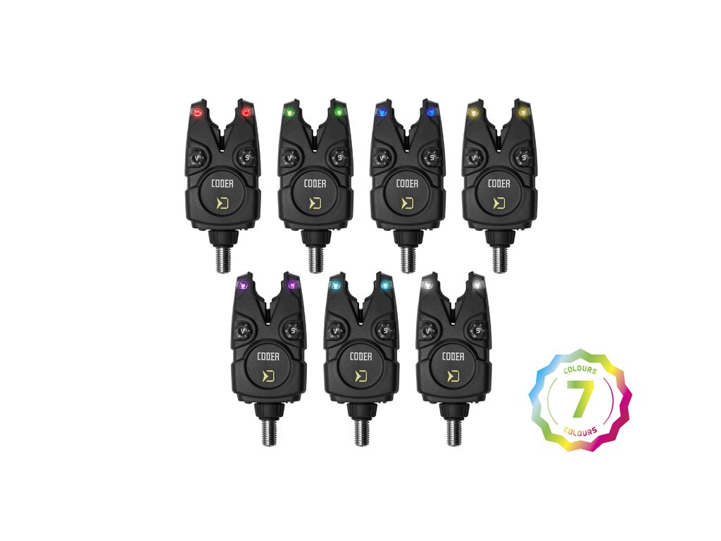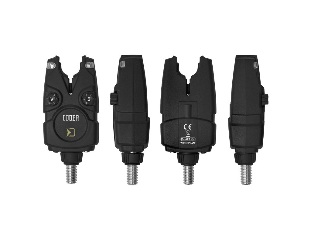 Signalizátor je napájaný 1x12V batériou typu LR23A, ktorá disponuje dostatočne dlhou výdržou. V prípade slabej batérie vás signalizátor upozorní krátkym pípnutím. Pomocou spínača "V" je možné vybrať jednu z 5. úrovní hlasitosti, vrátane tichého módu. Taktiež si je možné navoliť požadovaný tón a úroveň citlivosti (v rozmedzí 1-9cm), ktoré majú rovnako 5 rôznych úrovní. Nespornou devízou signalizátorov zo sady CODER je možnosť výberu spomedzi 7 farieb signalizačnej LED diódy. Každý si tak vyberie svoju obľúbenú a pokiaľ zatúžite po zmene, tak si jednoducho zvolíte inú farbu podľa návodu. Na spätný záber vás upozorní odlišný tón a po každom zábere sa rozsvieti na dobu 15 sekúnd pamäťová dióda. V spodnej časti sa nachádza vstup pre 2,5 mm konektor pre pripojenie svietiaceho indikátora. Počas nočného lovu je možné zapnúť taktiež pozičnú diódu.