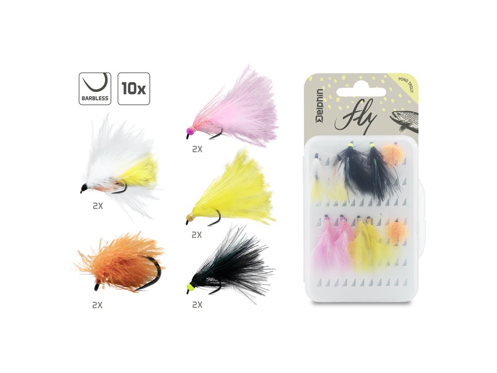 Sada umelých mušiek určených najmä na lov lososovitých rýb. V krabičke nájdete desať mušiek v piatich overených vzoroch naviazaných vo výrazných farbách. Použité farebné kombinácie sú ideálne najmä na lov čerstvo nasadených rýb, pre ktoré sú doslova neodolateľné. Rovnako dobre však často vydráždia k záberu aj staršiu opatrnú rybu.Mušky sú vhodné na aktívny spôsob lovu, pri ktorom sa oživujú sťahovaním šnúry. Kombinácia dlhého pohyblivého chvostíka a dráždivých farieb zaručuje aktívne vyprovokovanie rýb v okolí k záberu. Okrem použitia s muškárskou šnúrou ich možno skombinovať aj s prívlačovým prútom, a to v spojení so sbirolínom či bublinou.