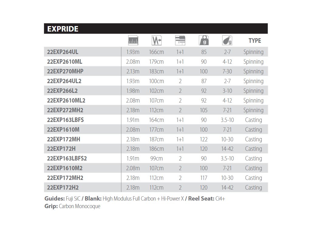 Pôvodne vyvinutý ako prút na basy, ľahko pochopíte, prečo sme z radu Expride takí nadšení. Ak hľadáte prút, ktorý splní vaše vysoké očakávania, nehľadajte ďalej, Expride je bezchybný. Či už ide o ľahké, stredné alebo dokonca veľké nástrahy, s navijakmi na spinning alebo baitcasting, rad Expride pokrýva všetko a s citlivosťou, ktorej sa len málo prútov vyrovná. Každý model je dokonca dostupný v dvoch konfiguráciách, 1+1 (jednodielny s odnímateľnou rukoväťou) a 2-dielny (rovnako dlhé časti). Naozaj máte z čoho vyberať.