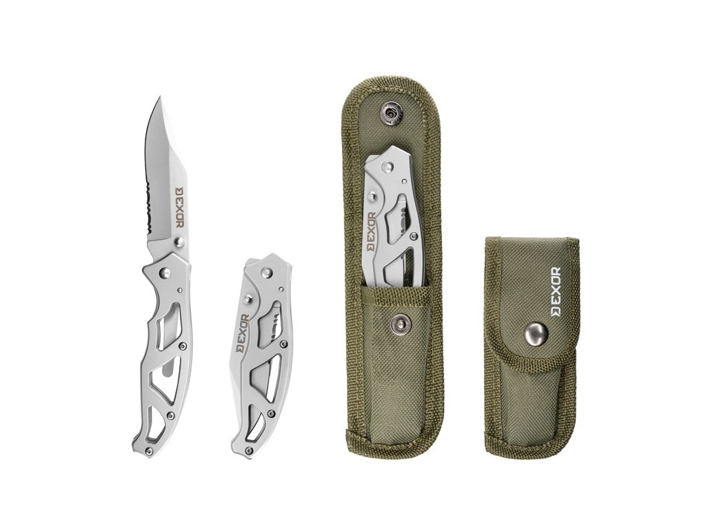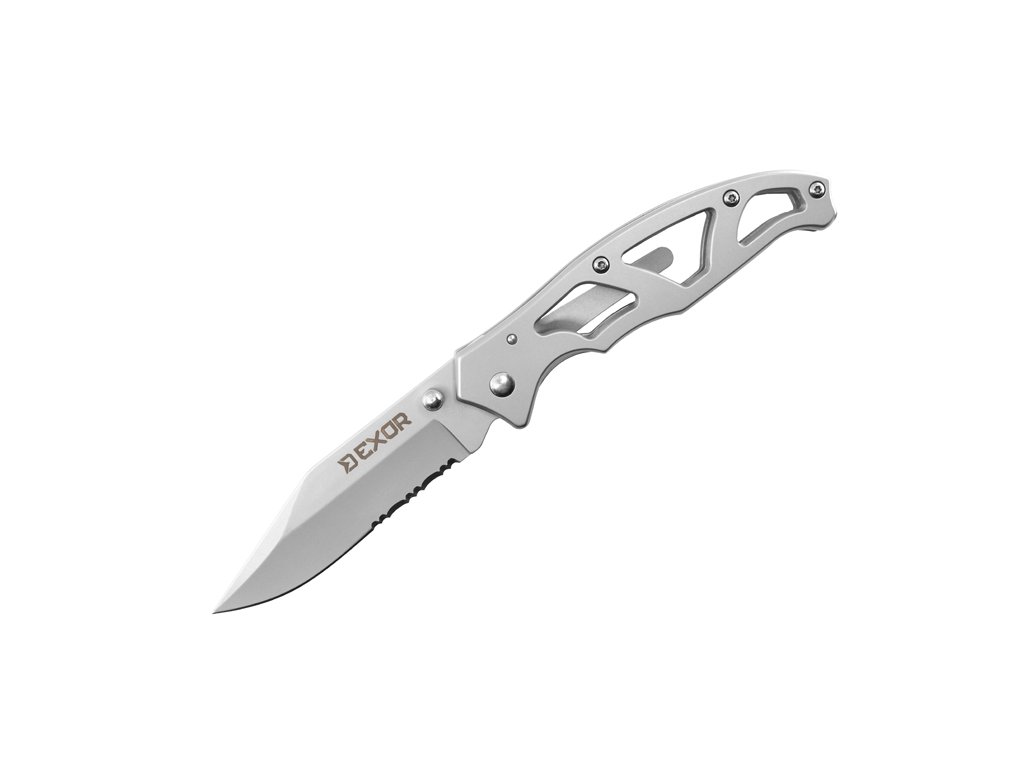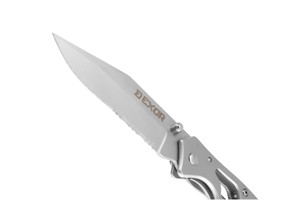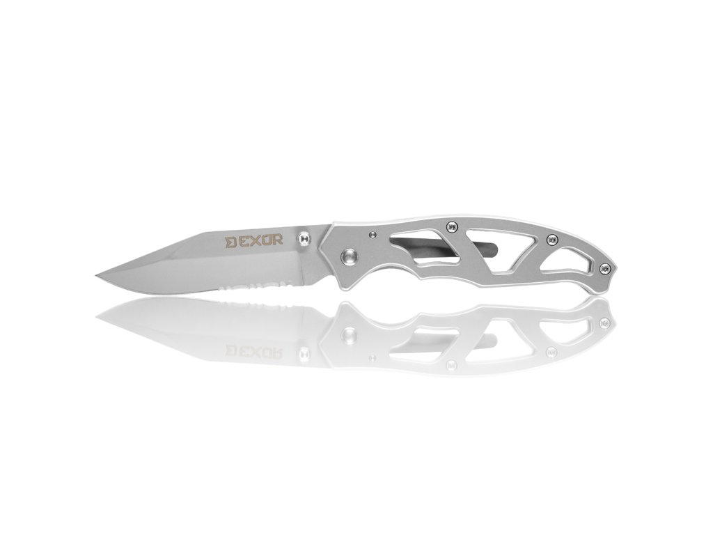 Skladací nôž EXOR predstavuje ideálneho spoločníka pre každého rybára či outdoorového nadšenca, ktorý hľadá maximálnu funkčnosť v minimalistickom prevedení. Tento skladací nôž už na prvý pohľad zaujme svojou celokovovou konštrukciou a moderným dizajnom, kde dominuje skeletonizovaná rukoväť. Práve toto riešenie výrazne znižuje celkovú hmotnosť, vďaka čomu nôž v taške či vrecku takmer neucítite, no zároveň si zachováva extrémnu tuhosť a odolnosť pri manipulácii.Čepeľ noža je vyrobená z kvalitnej nehrdzavejúcej ocele a disponuje kombinovaným ostrím. Klasická hladká časť je doplnená o zúbkované ostrie, čo robí z modelu EXOR univerzálny nástroj schopný hravo prerezať aj tuhšie materiály, laná alebo hrubšie vlasce. Na čepeli sa nachádza praktický výčnelok pre rýchle a pohodlné otváranie jednou rukou.