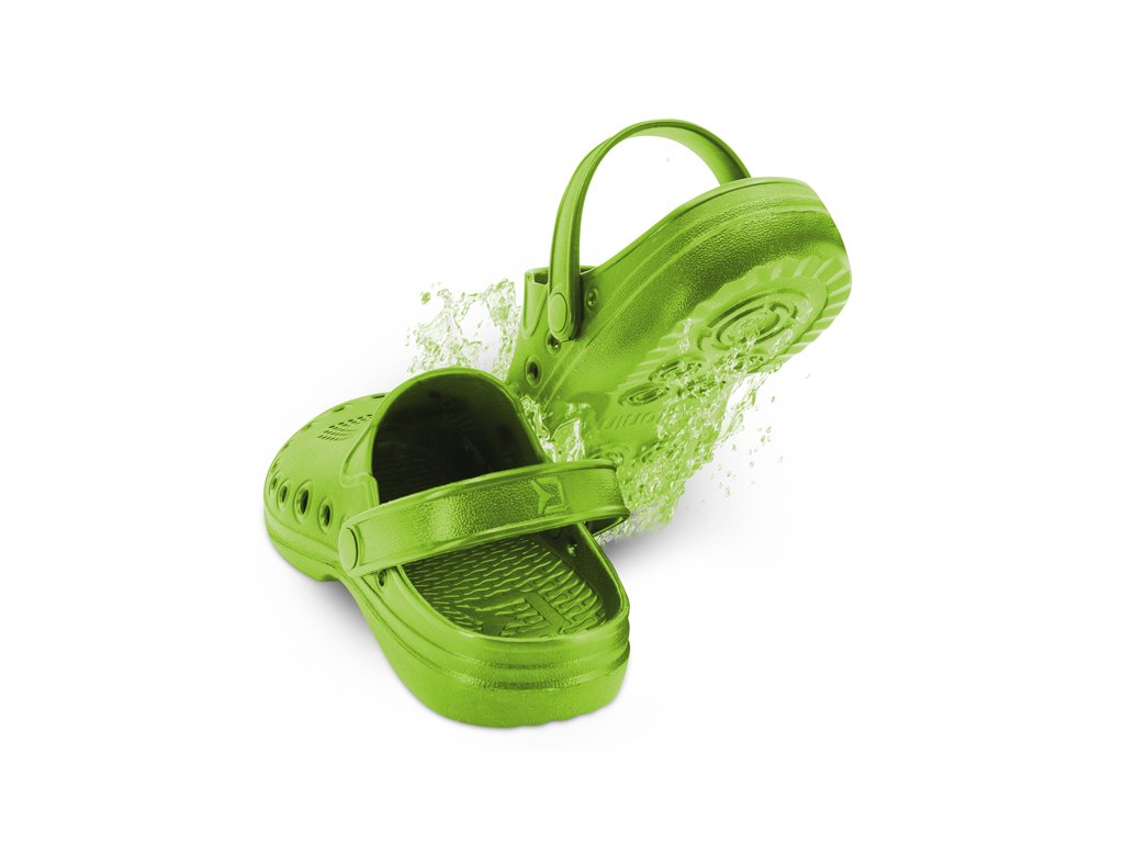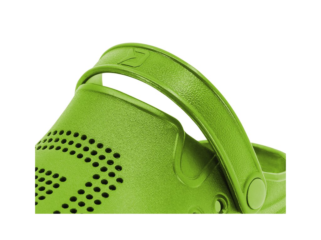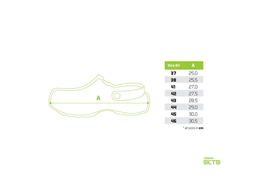 Ďalším sofistikovaným prvkom sú veľké postranné otvory, ktorých prioritnou úlohou je starať sa o odvetrávanie a celkovú vzdušnosť v tejto obuvi. Zámerne nie sú navrhnuté vo výške podrážky, ako to býva štandardom, ale o niečo vyššie. Práve tento detail zohráva významnú úlohu počas pobytu na brehu, či plytkej vode. Tým, že otvory sú o niečo vyššie nad vnútornou stielkou je takmer eliminované nechcené naberanie piesku či kamienkov medzi podrážku a chodilo. Vaše chodidlá sú teda chránené v maximálnej možnej miere. Okrem týchto otvorov slúži na odvetrávanie hustá perforácia umiestnená vo vrchnej časti. Tá je zámerne vytvarovaná na jednej strane do symbolu D z loga Delphin, na druhej vsuvke zase kraľuje symbol O, ako počiatočné písmeno názvu OCTO. Celkový dojem ešte zhodnocuje jemná štruktúra na povrchu šľapiek, ktorá evokuje kožu chobotnice. Vďaka použitému EVA materiálu sú mimoriadne ľahké, húževnaté a dokonca plávajúce. Samozrejmosťou je u tohto modelu popruh na fixáciu päty (ľudovo nazývané aj uzávierka), ktorý oceníte najmä v nerovnom, či svahovitejšom teréne.