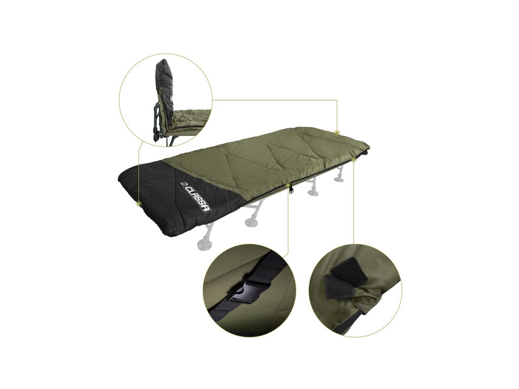 Na oboch koncoch spacieho vaku CLASSA sú zo spodnej strany našité prevleky, slúžiace k natiahnutiu na lehátko. Výhodou je fixačný popruh s masívnym klipom v strednej časti spacieho vaku. Vďaka prevlekom v kombinácií s popruhom nebude dochádzať k neželanému krúteniu na lehátku. Práve tieto prvky rozhodne nie sú samozrejmosťou pri spacákoch z podobnej cenovej kategórie a sú veľkou devízou modelu CLASSA.