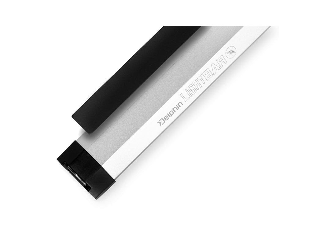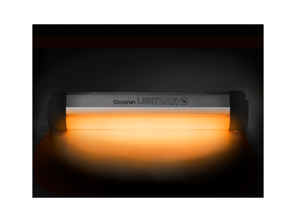 Delphin LightBAR UC je vysoko praktické bivakové svetlo, vďaka ktorému vás tma viac nezaskočí. Disponuje dvoma farbami, pričom každá z nich má niekoľko úrovní svietenia. Pri prvom stlačení sa rozsvieti biele svetlo s 5% svietivosťou. Druhým stlačením sa rozsvieti na 30% a pri treťom stlačení žiari biele svetlo na 100%. Pri štvrtom stlačení sa biele svetlo rozbliká, čo oceníte napríklad pri vyvážkach na veľkých vodných plochách, kedy budete schopný jasne definovať, kde na brehu sa nachádza váš tábor.Pokiaľ stačíte tlačidlo 5. krát zmení sa farba z bielej na oranžovú s 50% svietivosťou. Pri šiestom stačení sa oranžové svetlo rozsvieti na 100%. Takáto farba má niekoľko výhod. Okrem toho že je neopozeraná, podstatne eliminuje prítomnosť komárov a iného hmyzu vo vašom okolí, čo je na nezaplatenie najmä pri večernom posedení pri vode. Počet stlačení platí pre manuálne ovládanie priamo spínačom na svetle. Samozrejmosťou je ale aj pribalený diaľkový ovládač, ktorý samostatne ovláda biele a oranžové svetlo a tým výrazne skracuje reakčnú dobu pre zmenu svetla.