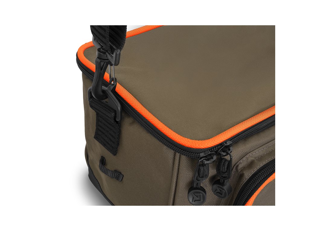 Taška je zhotovená z kvalitných a odolných materiálov. Navyše je jej spodná časť dodatočne chránená gumovou vrstvou presahujúcou nad dno tašky pre zamedzenie prestupu vlhkosti z mokrej zeme. Hlavnú časť tašky tvorí dostatočne veľký ukladací priestor, v ktorom je už v základe umiestnený priehľadný plastový box s usporiadateľnými priehradkami, vďaka čomu budete mať dokonalý prehľad nad jeho obsahom. Box je svojimi rozmermi vhodný napríklad na prívlačové nástrahy, feedrové krmítka, či iné menšie príslušenstvo.